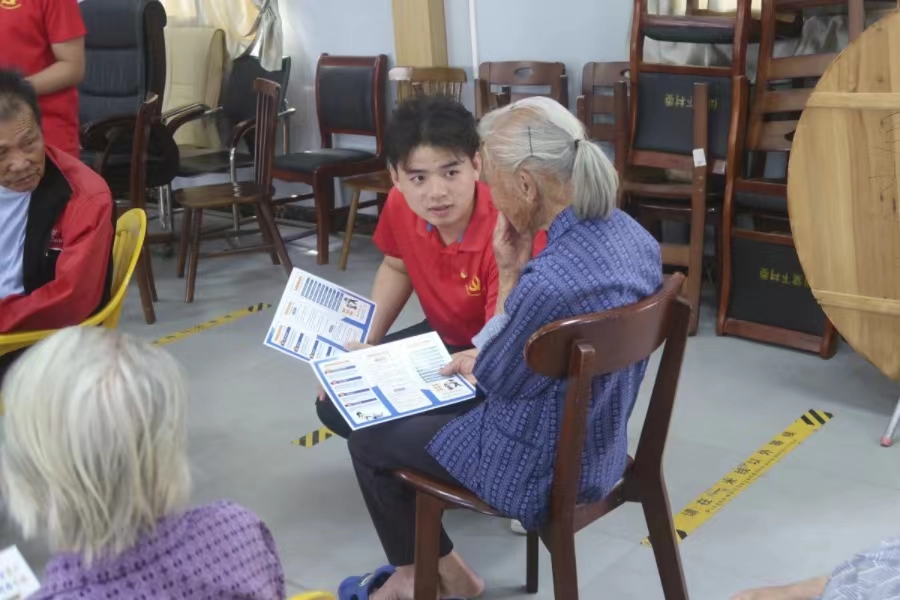 在活动现场,党员们向现场的社区老人分发安全知识宣传海报,旨在让社区居民提高网络安全意识,谨防电信网络诈骗。针对社区老人的实际情况,党员们提出日常生活中常见的安全问题,同时重点讲解了如何防范电信诈骗,提醒社区老人不轻信、不透露、不转账、要及时报案。