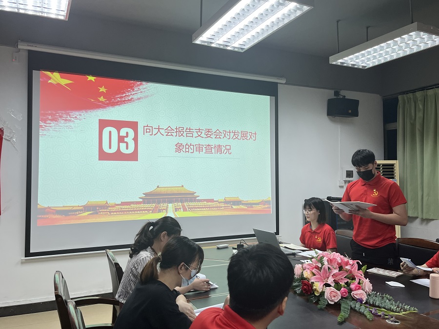 接着,由员工副书记曾李锋同志向大会报告支委会对发展对象的审查情况,宣布钟观带等6名重点发展对象的审查结果全部通过。在与会党员对发展对象是否符合党员条件发表意见进行不记名投票表决环节时,非正式党员在会议室外稍作等候。统计票数后,由宣传委员王薇薇同志宣读支部大会的决议:同意钟观带等6名重点发展对象转为中共预备党员。