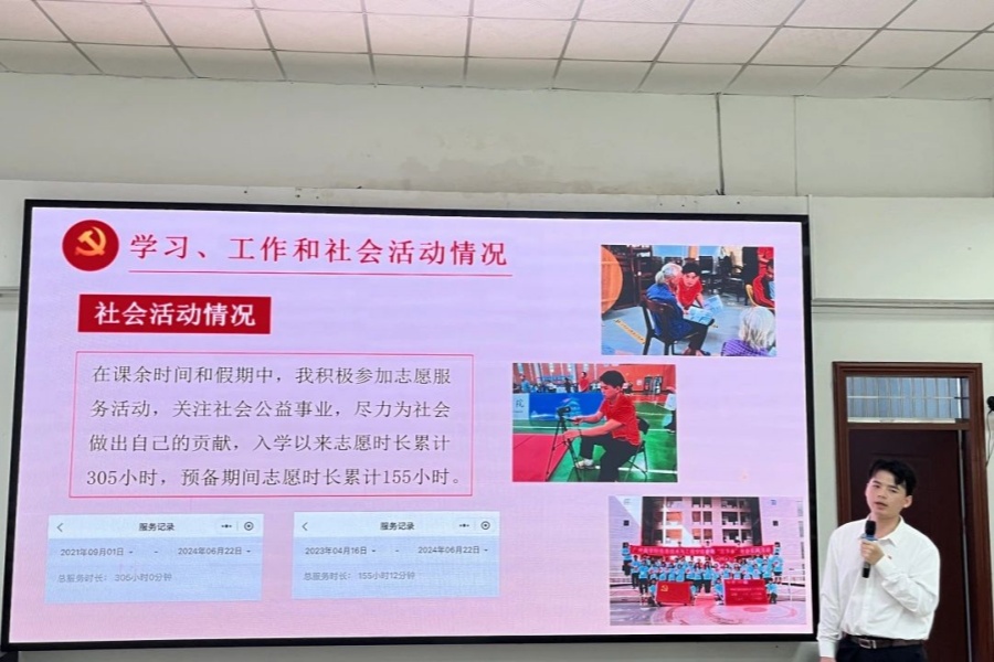 入党介绍人甘志健和杨艳美分别从政治思想、榜样作用等方面对陈宇轩等4名同志在预备期的情况进行汇报,并表示同意陈宇轩等4名中共预备党员同志按期转正。
