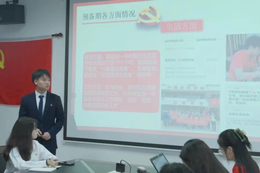 会议第四项流程,由周炼玉向大会报告支委会对徐少清等6名预备党员在预备期的考察情况,宣布徐少清等6名预备党员预备期的表现良好,符合转正条件。