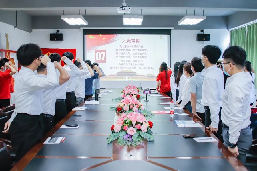 会议的最后全体党员起立面对鲜红的党旗,高举右拳庄重宣读入党誓词,铮铮誓言,让全体党员心中产生强烈的共鸣,铭记党员的责任和担当,充分发挥党员的先锋模范作用。