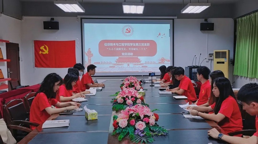 为迎接党的二十大胜利召开,深入学习贯彻习近平新时代中国特色社会主义思想。10月14日晚,suncitygroup太阳新城员工第三党支部在第六教学楼205会议室以线上线下相结合的方式开展“矢志不渝跟党走,青春献礼二十大”主题的党日活动。出席本次会议的有党支部书记朱国华同志,教师党员陈钰纯同志、胡舒娅同志以及全体员工党员。本次会议由蓝佳琪同志主持。