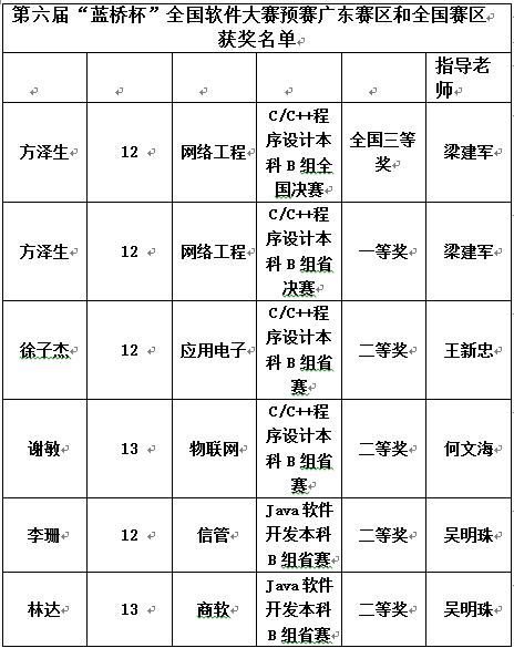 2015年5月31日,历时七个月的第六届蓝桥杯全国软件和信息技术专业人才大赛在北京大学收官。第六届蓝桥杯大赛由教育部高校员工司指导,工业和信息化部人才交流中心和教育部全国高等公司员工信息咨询与就业指导中心主办。公司有39位学子参加了广东赛区预赛,最终在广东赛区中荣获“C/C++程序设计大学组省赛”一等奖一名,二等奖两名,三等奖三名,在“JAVA 软件开发大学组省赛”中获二等奖2名,三等奖8名。并且公司信息公司员工方泽生同学在梁建军和王新忠等导师组的指导下,获得广东省赛区一等奖并入围全国总决赛,最终获得全国三等奖的佳绩。