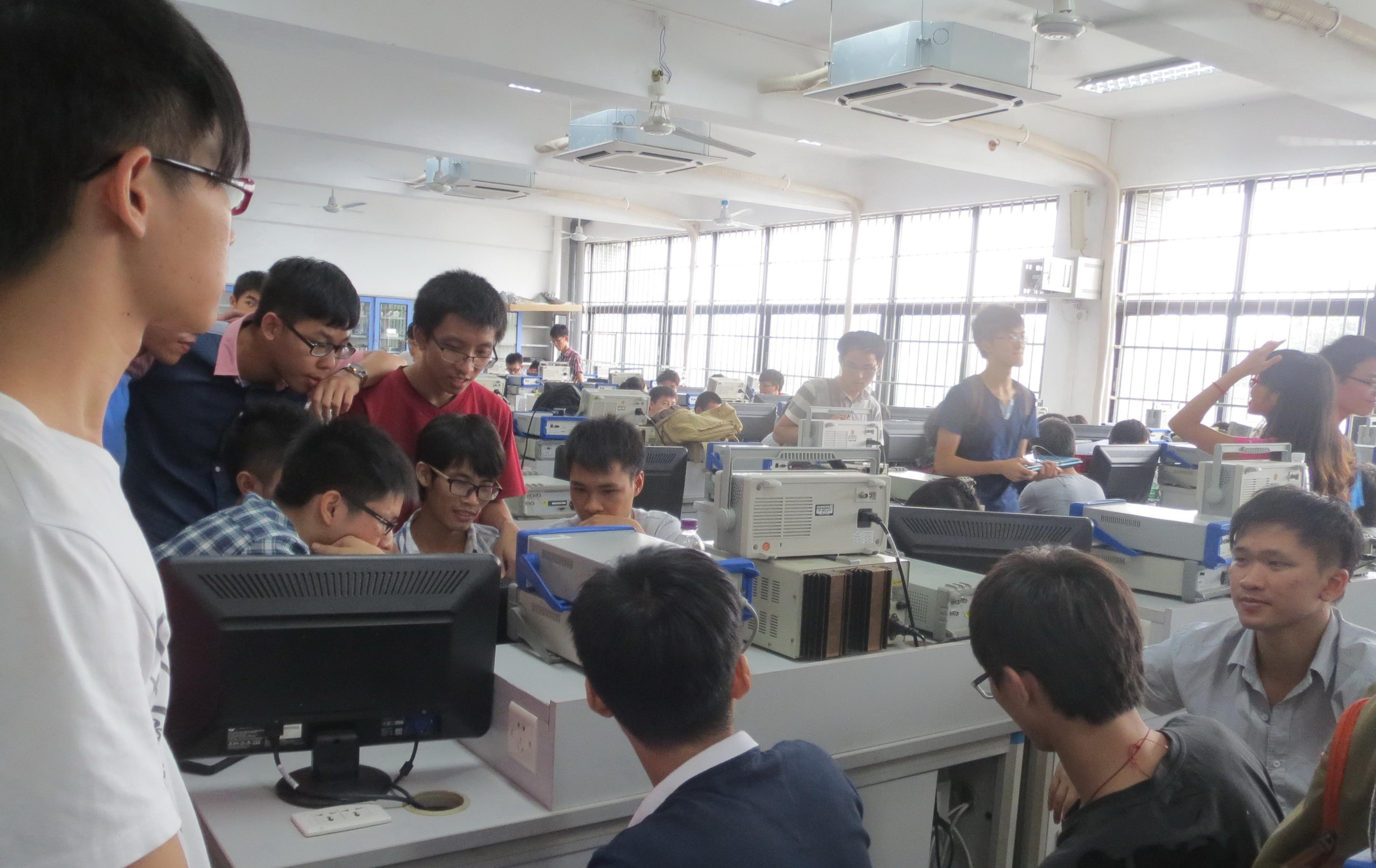 在实验室认真钻研和讨论的计算机系参赛学子