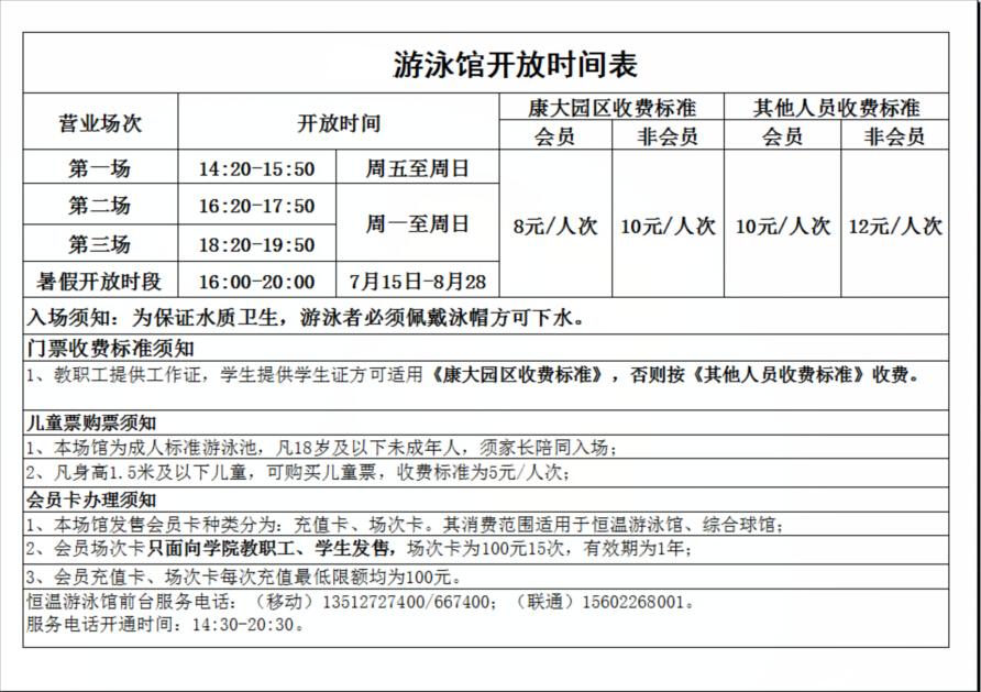 我部已于日前完成了游泳馆开放前的各项准备工作,游泳馆从2014年6月20日(周五)开始对外开放,具体开放时间,收费标准,详见《游泳馆开放时间表》。
