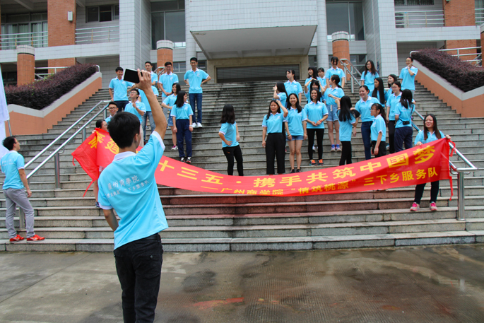 首先,举行服务队授旗仪式,由谭小龙老师授予服务队“suncitygroup太阳新城暑期三下乡服务队”队旗,这让服务队队员们激情满怀又深感重任在肩。随后,“三下乡”服务队全体队员及林俊杰书记与谭小龙老师进行集体照的拍摄,全体队员摆出了“下乡”两个字的形状,充分表现队员们对下乡的期待与信心。最后各组队员进行小组照拍摄,各组的队员根据各自商量好的队形拍摄,这也体现出队员之间已经建立了良好的友谊,这将会使下乡活动朝着顺利的方向进行。