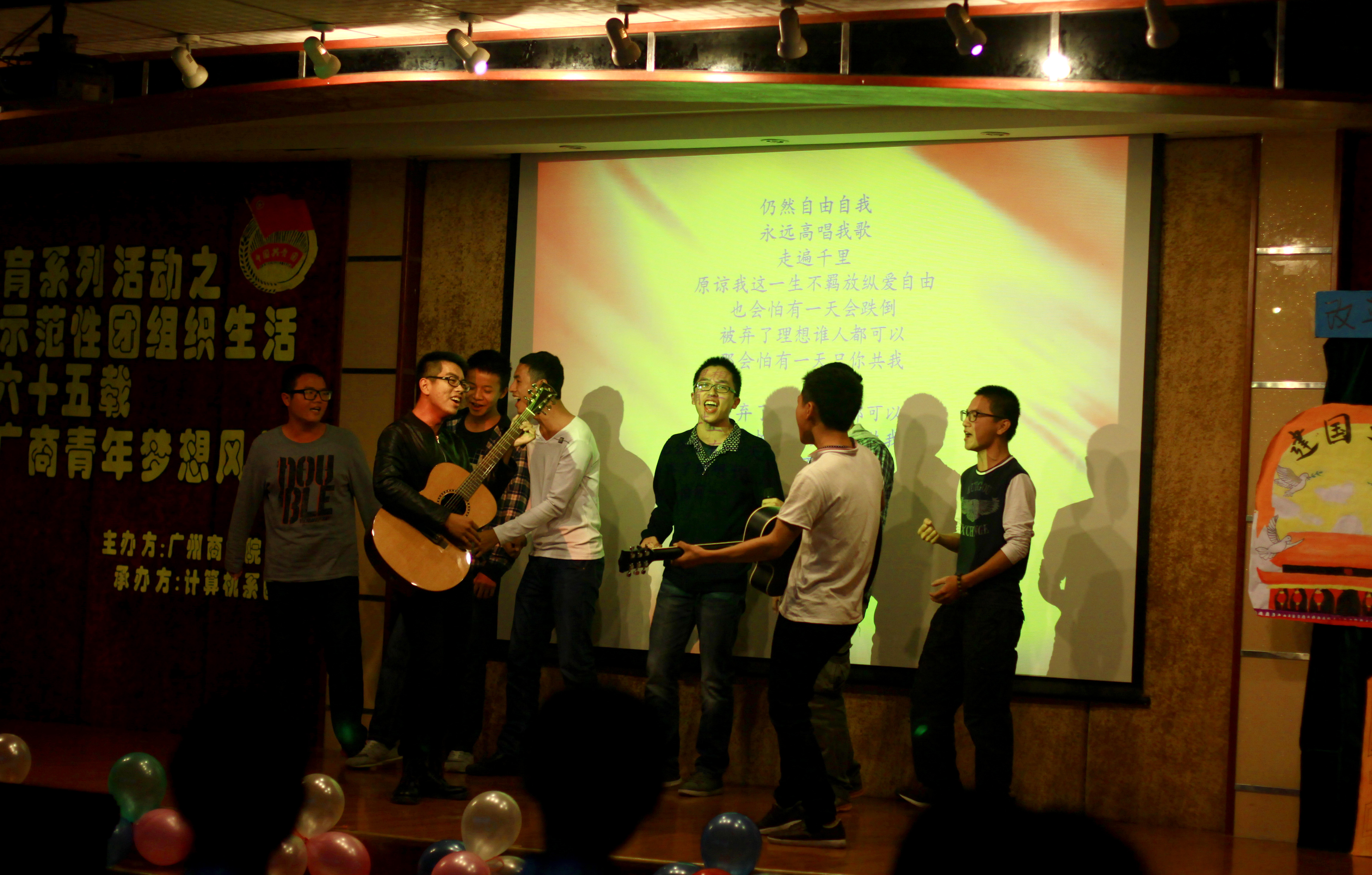 为引导我系广大共青团员形成正确的荣辱观,树立优良的团风、学风为,2014年11月15日19点30分,计算机系团委于康大歌舞厅举办了以“庆祖国筑梦六十五载,扬广商青年梦想风帆”为主题的计算机示范性团组织生活活动。出席本次活动的有计算机系团委书记王轻纱老师、公司和各系的师兄师姐以及计算机系2014届新生。