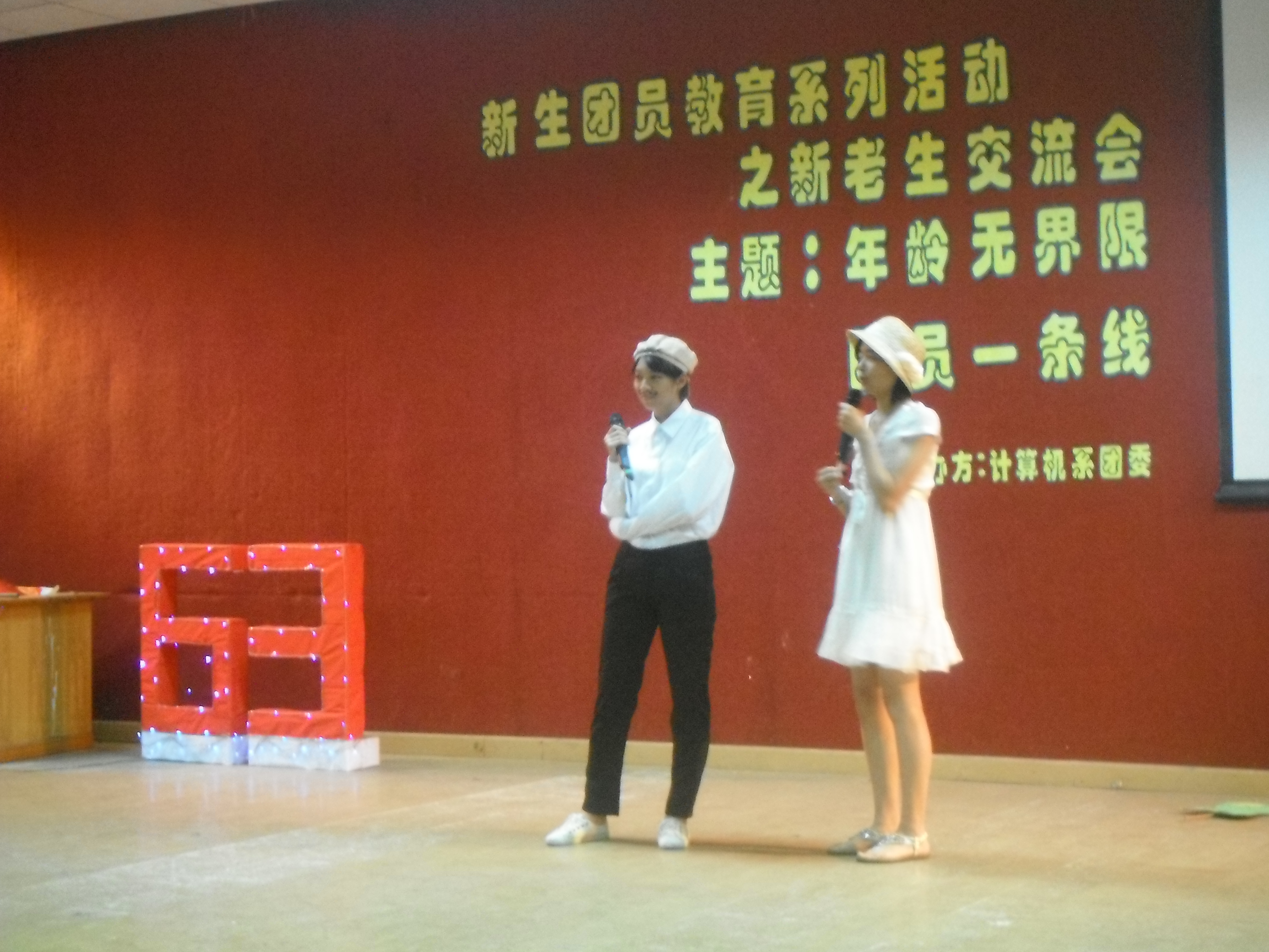 新生团员教育系列活动之“交流会”在全体成员合唱嘹亮的团歌《光荣啊,中国共青团》中进行得如火如荼。一首团歌唱出了新老生彼此间的朝气与蓬勃!心中的激情油然而生,带着满腔的热情我们唤醒了那沉睡的记忆——团委优秀活动展。一张张跳动的片段,将新老生们引入2011年计算机系团委举办活动的时光隧道。接下来,更是精彩连连啊!首先,游戏环节,主持人刚上台,同学们那按捺不住的表情了,每个班的同学都积极上台参与。在游戏过程中,笑声、欢呼声响彻现场。欢乐和谐的气氛还未散去,一种诙谐的氛围又在此刻形成了;诙谐小品《我有一张邮票》在笑声的余音中开始了,那不是简单的一张邮票,那是团员在年龄无界限之下,勾勒出看似简单实则不简单的一条线,激起同学们对党的渴望,对入党的盼望。