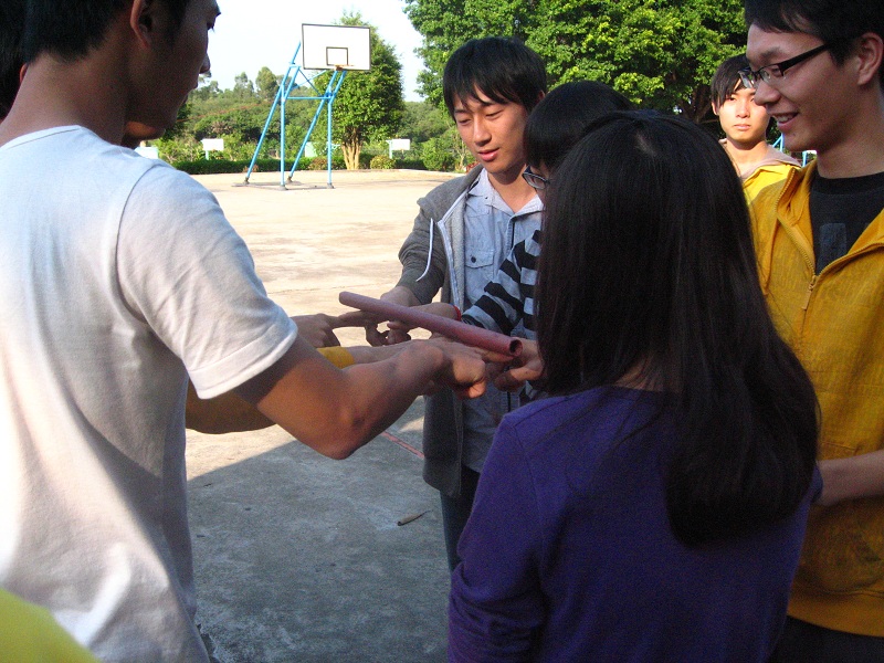 各队运动员怀着坚定的信心,踏着轻快的脚步,带着必胜的决心,在同学们的欢呼声中风风火火地进场了。下午三点整,紧张的比赛终于开始了。第一个环节——争分夺秒热身操。在这个环节中,各团支部男运动员们纷纷show出他们过人的体质,引来了同学们阵阵的惊呼声。经过一番热身,更大的挑战向他们徐步走来:齐心协力抬棍子、定点投篮接力赛、超级无敌猜猜猜以及踢足球。主办方精心设置的每一个环节无不考验着他们的团队合作能力,只要他们能够齐心协力,能够将八条心拧成一条绳,要想顺利完成任务绝对不是难事。经过一下午的比拼,各支队伍的表现都出色,同时都取得了不错的成绩。拉拉队们也是铆足了劲的给他们支持的队伍加油鼓劲。篮球场上洋溢着同学们呐喊加油声,不时还传来他们欢乐的笑声,俨然就是一片欢乐的海洋。