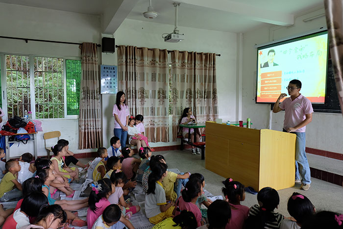 小老师通过讲述贴近生活的历史小故事,形象生动地向孩子解释了八字真经的含义,让孩子们逐渐树立并践行社会主义核心价值观。课堂上,看着孩子们那专注的眼神,志愿者们也深深地沉醉到其中。或许所讲内容有些许深奥,但孩子们仍博学之,审问之,慎思之,“四个全面”的声音随即也萦绕耳畔。