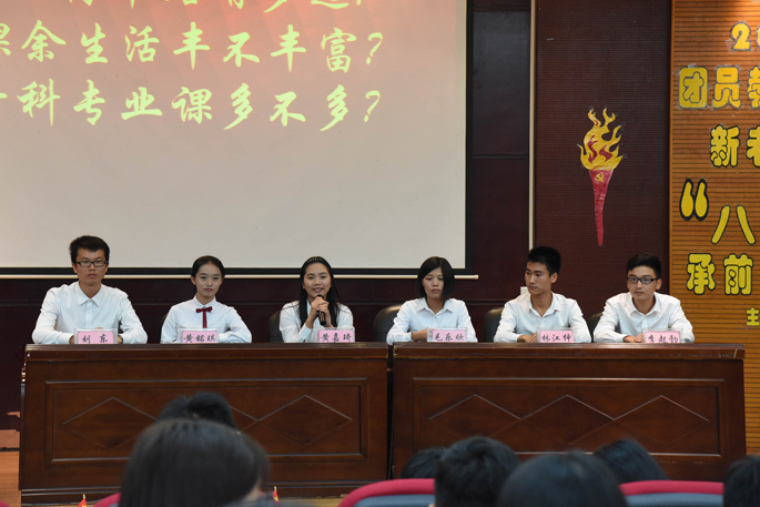 活动开始,同学们共同观看了关于中国红军长征胜利80周年的视频——《风雨80》,一段无法被时间遗忘的历史就呈现在同学们的面前,红军长征精神深深地感染着同学们。随后,进入优秀员工代表发言环节,黄铭琪同学和刘东同学围绕大学四年时间规划和学科竞赛的相关问题,和同学们分享了个人的心得体会和学习方法;毛乐欣同学和黄嘉琦同学分享其个人对老员工活的感受,包括员工干部注意事项和全面发展相关问题;李起勃同学和林江绅同学向新生介绍其所代表的团支部取得的优秀成绩,并向新生就如何构建如何优秀团支部提出了部分建议。之后开展了别具生面的新老生问答环节,新生们纷纷提出心中的疑惑,如怎样兼顾学习和组织工作等问题,师兄师姐们则耐心地为其一一解答。在此期间大屏幕播放的视频《青春回忆录》勾起了新生们入学报到时和军训期间的美好回忆。