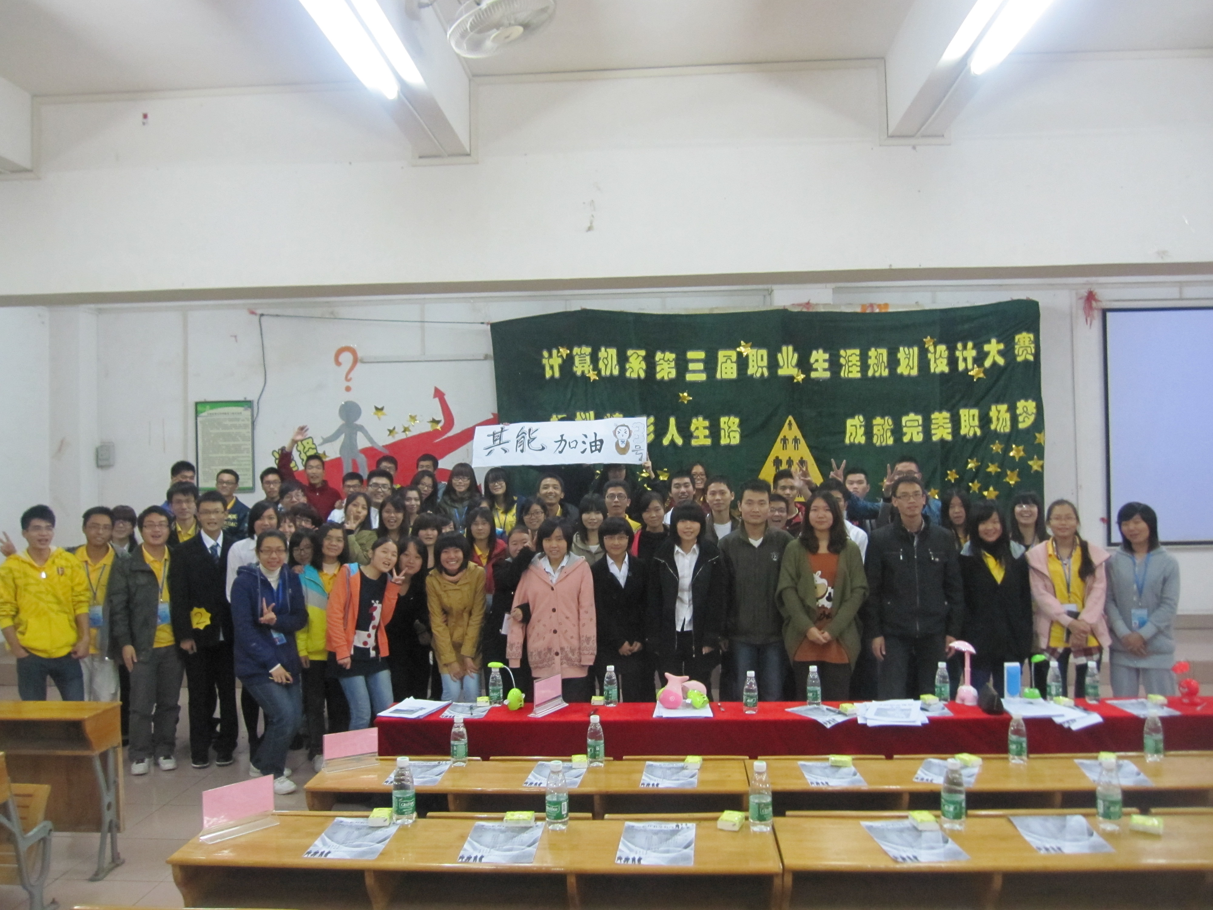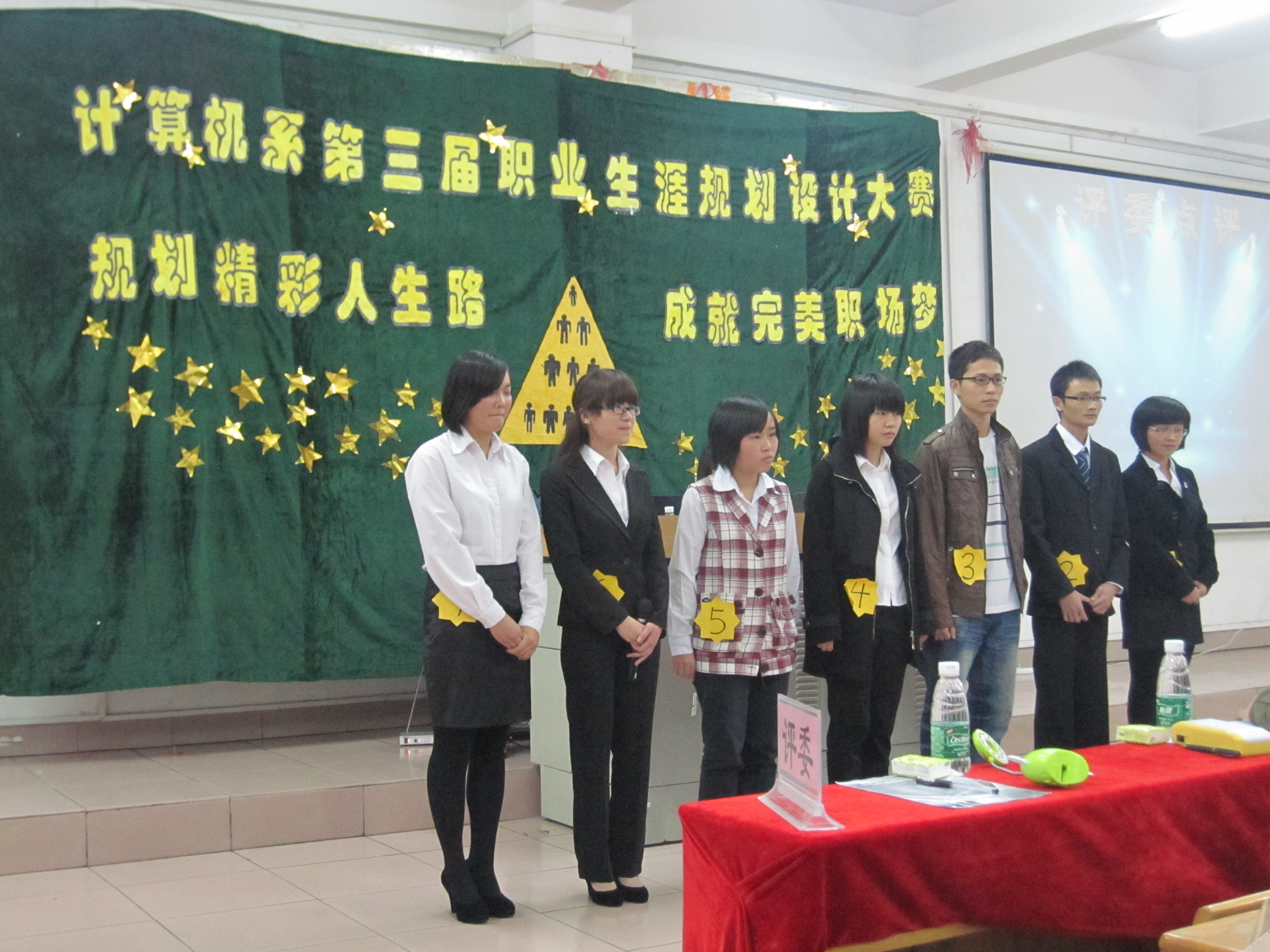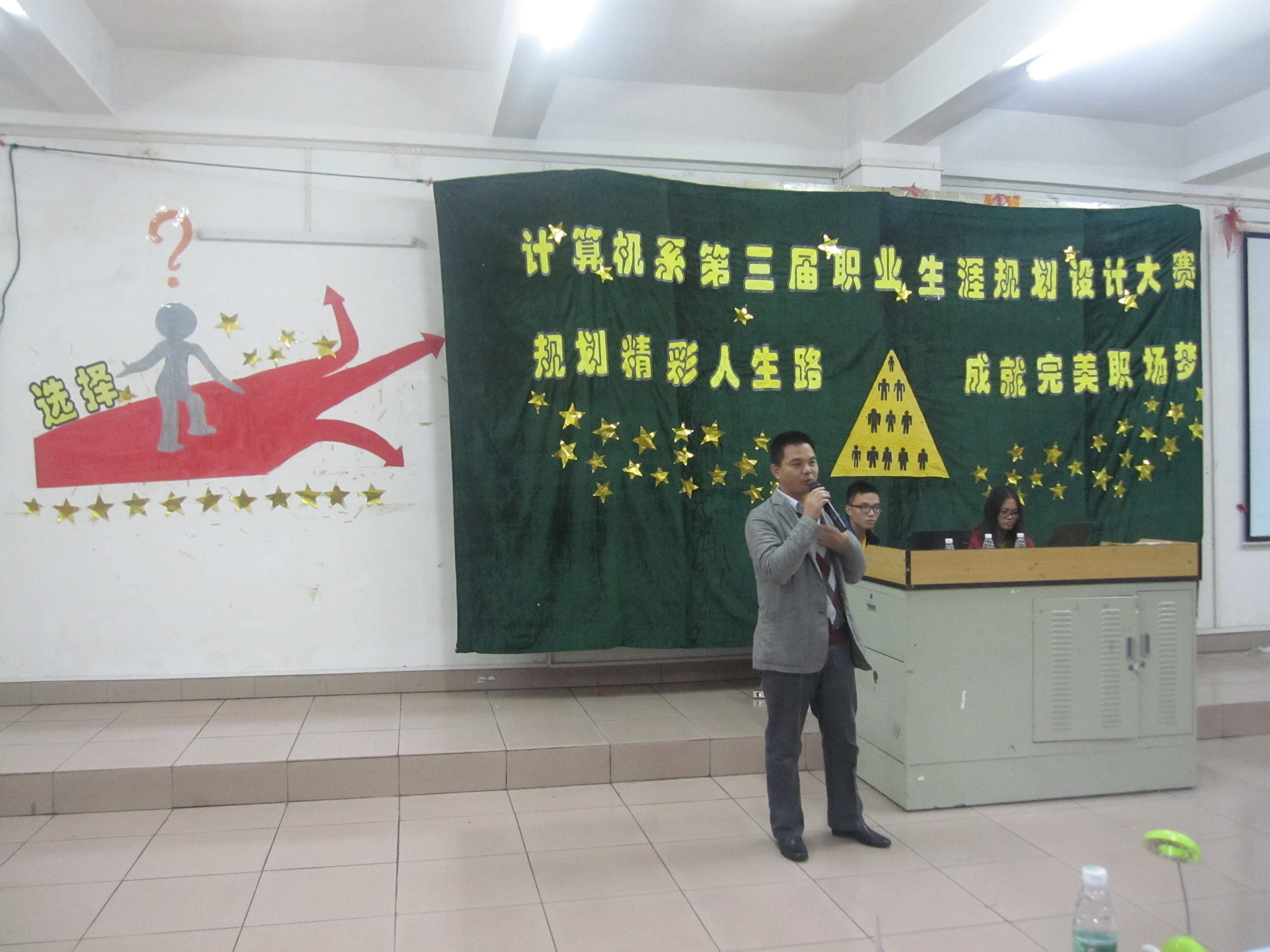 今天站在哪里并不重要,重要的是你正朝哪个方向走。大学是职业生涯发展的最佳探索期,确定自己的学习方向和职业生涯,做好职业规划,你便会有目标,有了目标你就能更有效地学习,赢在起跑线上。为了引导同学们深入了解自己、明确自己的发展方向、定位自己未来的职业、发掘自己的潜能、提高自己的就业竞争力,11月30日晚上7时30分我系以“规划精彩人生路,成就完美职场梦”为主题在教学楼A109开展第三届职业生涯规划大赛决赛。