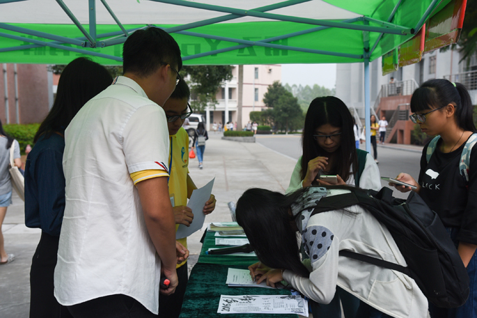 摆摊开始之前,有空课的干部们积极准备摆摊所需用品,布置好摊位。临近放学,信息公司团委的干部们带着宣传单与报名表在公司各摊点处开始宣传。面对过往的同学,干部们满怀热情地向其介绍本次APP创意大赛的参赛信息。亦有干部在主摊点通过音响设备大声地传播比赛内容,宣传效果可见一斑,对比赛的感兴趣的同学纷纷来到摊位咨询、报名。经过两天的宣传,同学们已渐渐熟悉APP创意大赛的相关内容,干部们也从宣传工作中学习到如何更好地与同学沟通交流。