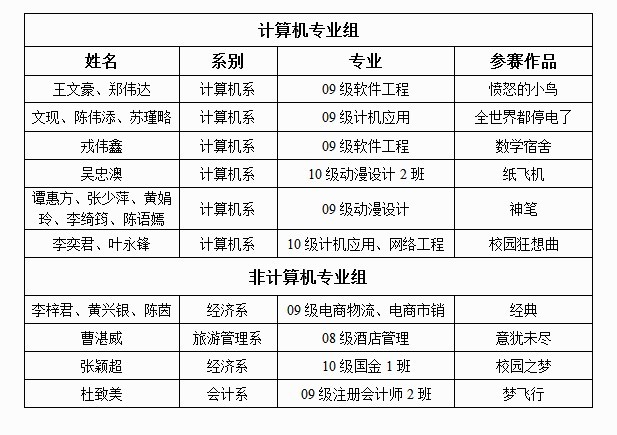 为了增强员工对计算机知识学习的兴趣,开拓同学们的创新精神,营造本院员工学习计算机知识的良好氛围,增强公司员工的就业竞争力。我系团委本着“为科技爱好者打造闪亮舞台”为宗旨,响应党中央提出的“创先争优”的伟大号召,切合公司“一体两翼”的教学方针,以“转变员工学习方式”为目的,承办“数字媒体设计”大赛此活动。在第二届“数字媒体设计”大赛决赛名单共有10份作品进入决赛,具体名单公示如下:(排名不分先后)