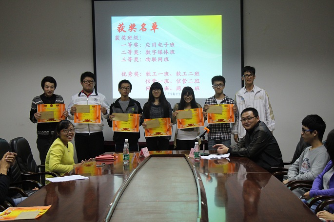 首先由林俊杰书记致辞以拉开帷幕,他介绍了近一年来公司学风情况以及学风工作,强调了加强学风建设的必要性。接着是播放2014级生活委员工作感想的视频,希望各位生委能够勿忘初心,带领班级为公司环境整洁献出一份力量。第三环节是颁奖环节,由林俊杰书记和谭小龙老师分别为获得劳动模范班级的一、二、三等奖及优秀奖颁奖,一等奖为2014级应用电子班,二等奖为2014级数字媒体班,三等奖为2014级物联网班。