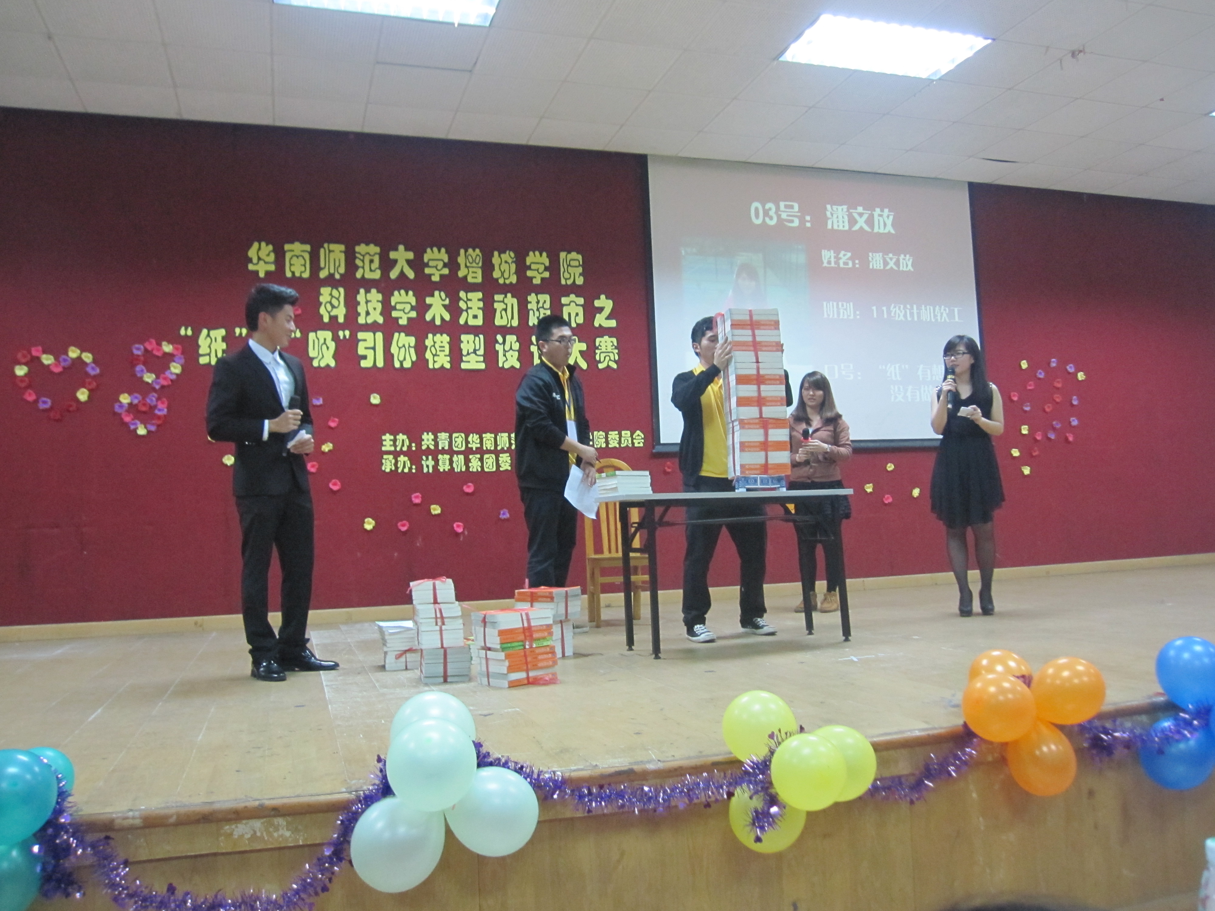 4月13日晚上7时30分我系团委于教学楼A206开展了科学技术超市之“纸”想“吸”引你模型设计大赛决赛。此次活动旨在培养老员工科技创新意识和动手实践能力,从而进一步发扬本公司科技创新实践能力,增添浓厚校园科技学术的氛围,让本院员工真正体会科技源于生活,激发广大学子的创新能力和提高实践能力。