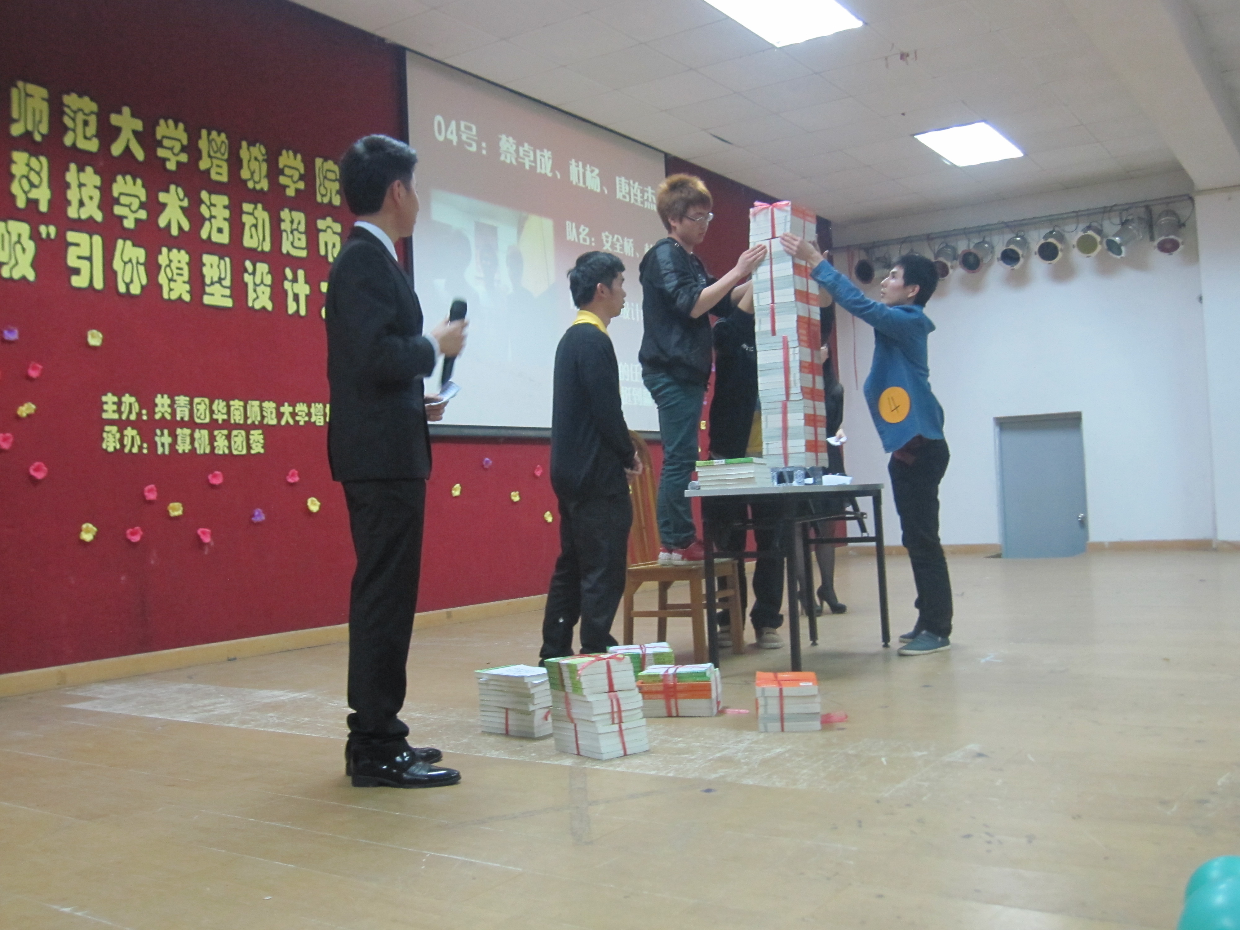 伴随着主持人介绍本次活动的比赛规则,纸牌桥和吸管桥各六组选手纷纷登场,信心满满的各团队都不甘示弱。首先是纸牌桥六组承重比赛,各组详细而有序地介绍了其桥的设计理念及参赛队名、口号。一捆一捆的书本往上堆垒,堆砌的高度不断上升,现场的热度不断上涨;现场的观众无一不屏住呼吸,全神贯注于桥能否承受书本的重量!尤其体现于纸牌桥第四组“安全桥”的承重比赛中,它让我们见证了小小的纸牌桥能承载40千克的奇迹,并将活动首次推向高潮;由于比赛规定——在决赛中只可以累加四次重量,为此“安全桥”的承载量对于观众来说至今还是个谜。活动在如火如荼的进行中,场上场下鸦雀无声,生怕有一丝的声响而影响到模型的承载。