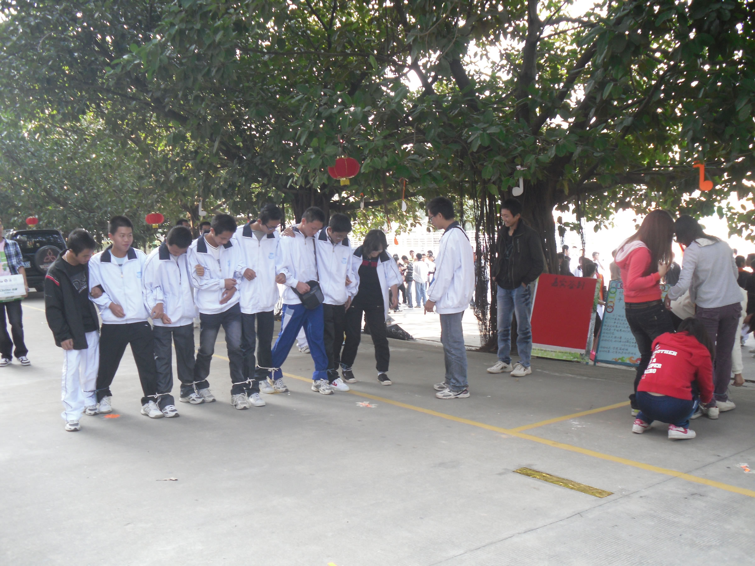 今天下午三点在排球场举行趣味运动会的决赛,同学们为了班集体的荣誉,在这里斗智斗勇。本次运动会由三个项目组成,分别是二人三足接力赛、三人三足争夺赛、八人九足竞赛。二人三足接力赛讲究默契与配合,参赛者用他们坚定的信念,为我们诠释着:就算跌倒也要重新站起来;三人三足争夺赛注重方法与策略,同学们用自己的聪明才智,为我们展现着:就算用跳也要跳过终点;八人九足竞赛注重团结与协调,同学们用自己的团队精神,向我们诉说着:身体平衡性和团队精神的重要性。整个比赛的过程中,场下观众的欢呼声、呐喊声、掌声一浪接着一浪,这不仅是一场比赛,更是一个增进同学之间感情的机会。