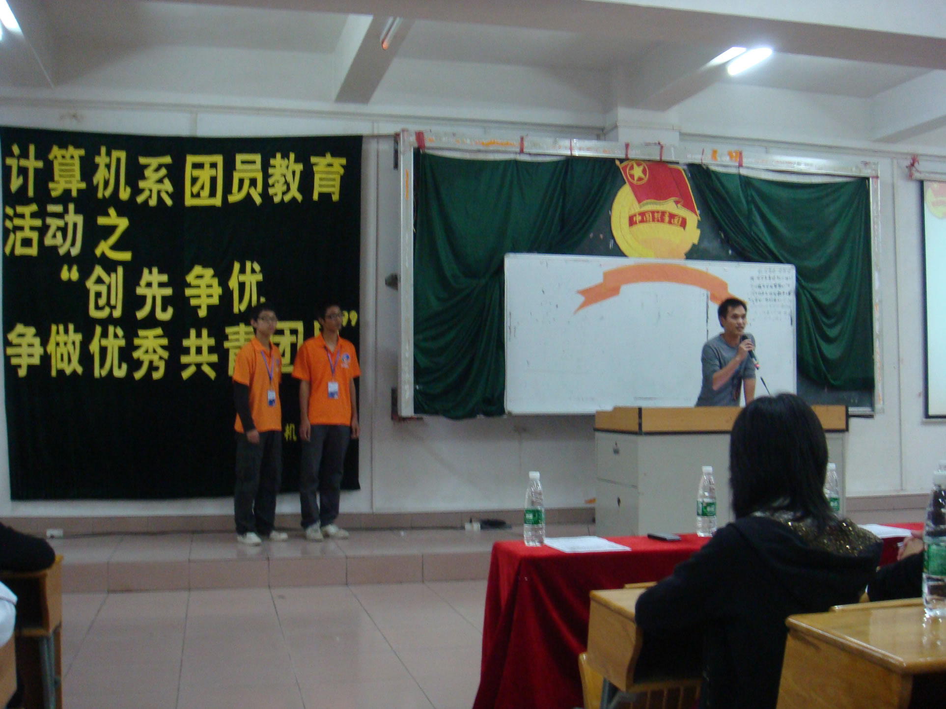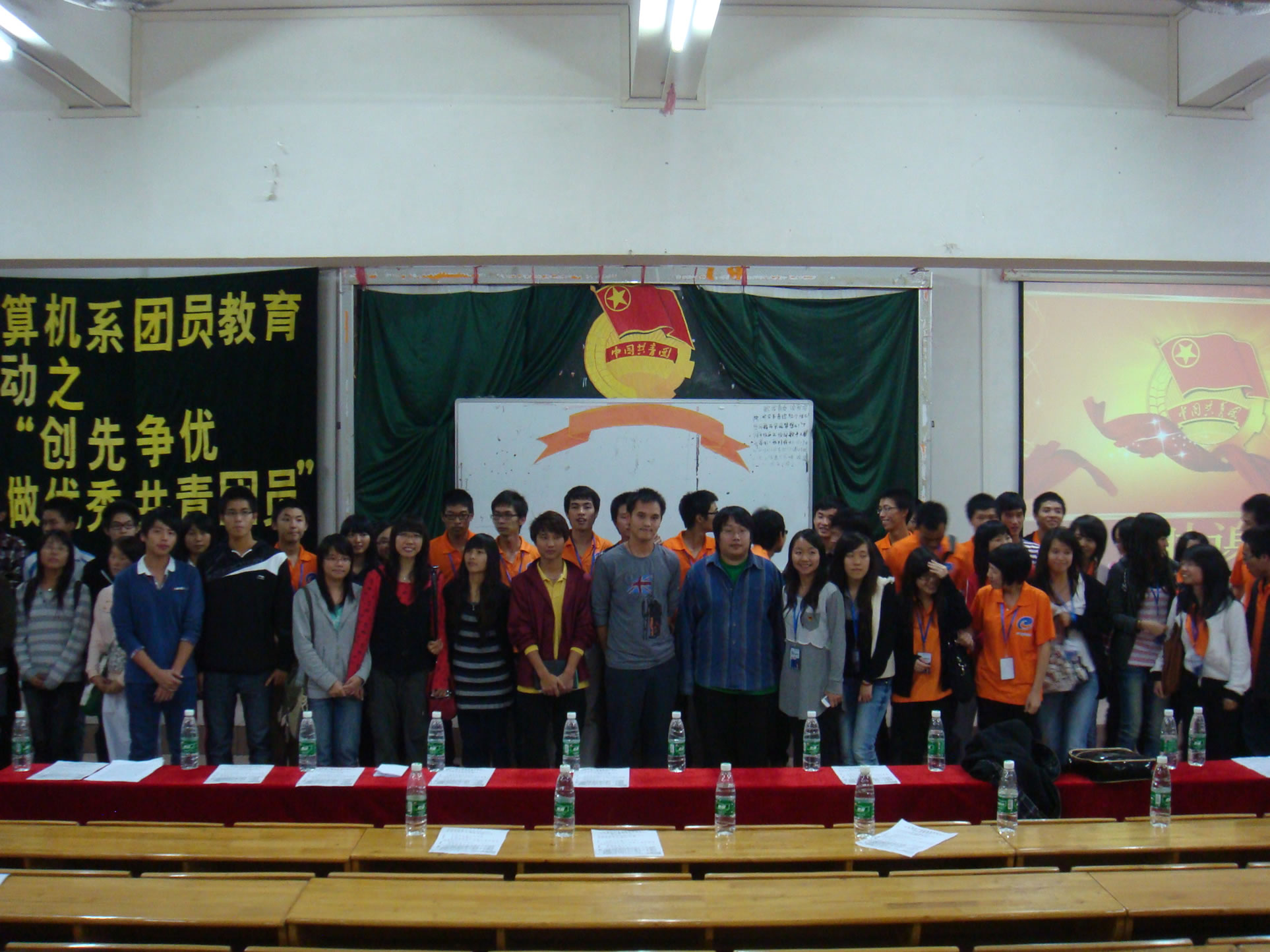 由计算机系团委主办的计算机系团员教育活动之“创先争优,争做优秀共青团员”于11月6日在A109举行。出席本次活动的嘉宾有系团委书记罗雄文老师、团委副书记张文盈同学、团委秘书长陈晓丹同学以及院系各部长。