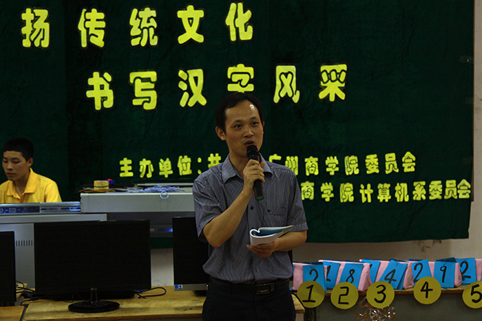 大会伊始,思想政治理论课教学部主任郑维铭老师便带来了一段令人深思的讲话。在其发言中,提及与英文相比之下,3000个汉字便能读书看报,而英文却需要更多的词汇量才能进行正常的阅读,老师更是希望同学们在学习外语的同时,能够不忘本,真正懂得领悟汉字的奥妙所在,学习其深厚的文化内涵。其后,计算机系党总支钟远辉书记在讲话中道出3个“感谢”,即感谢嘉宾们千里迢迢到达参与本次活动,感谢此次活动台前幕后工作人员的辛勤奉献,感谢参赛选手以及同学们的大力支持,更是希望能借此次活动,能够借计算机系的专业特色传承文化,展现汉字魅力。