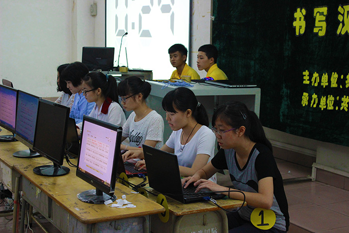 选手们全神贯注地进行汉字竞速