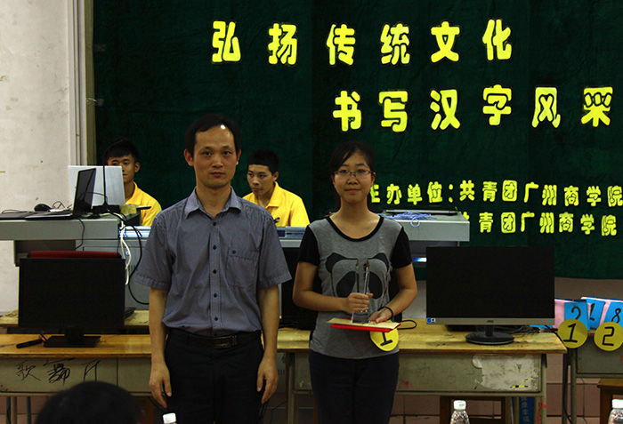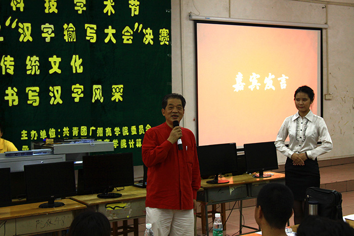 为增强广商学子的汉字学习兴趣,提高其汉字书写能力,使其更好地传承“汉字”这一民族文化瑰宝,计算机系团委于4月19日晚上19:30在课室a109举行主题为“弘扬传统文化,书写汉字风采”的第六届科技学术节之“汉字输写大会”决赛。莅临本次大会的嘉宾有思想政治理论课教学部主任郑维铭老师和副主任王相东老师、计算机系党总支钟远辉书记、计算机系14级辅导员毛西月老师以及各兄弟系代表。