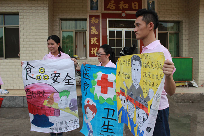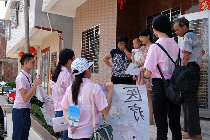 即便烈日当空,文宣组的成员始终手持宣传单举着海报,通过直观形象的宣传单和海报,对家家户户的村民进行细心地讲解。文宣组的队员先是从食品安全与医疗卫生这较为贴近生活的方面入手,再引出由习近平主席提出的“八字真经”和“四个全面”,简述两者之间的关系,尽可能地让村民们了解宣讲的内容及其意义。村民被志愿者们的热情和耐心所感染,满怀热诚地说:“你们都是八点钟的太阳,十分富有活力和朝气”,文宣组的成员们也高兴地自称为“八点钟太阳队”。