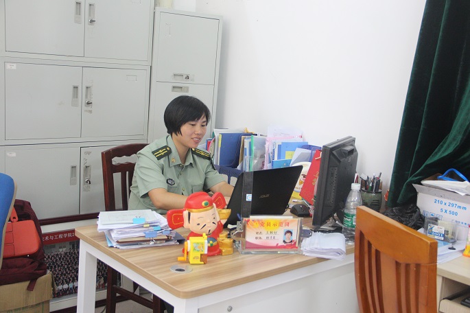 开学准备工作、迎新、体检、军训、宣传、内务、入学教育、安全知识讲座,信息公司辅导员王轻纱像停不下来的陀螺,二十四小时围着新生打转。她用简单的方法,将这些繁杂的事务统筹合理安排,使得所有事务能够有条不紊地进行。军训期间,她每天往返于训练场与办公室之间,既要负责共青团的工作又要处理好新生的大小事宜,她量力而行,做好自己的份内工作。