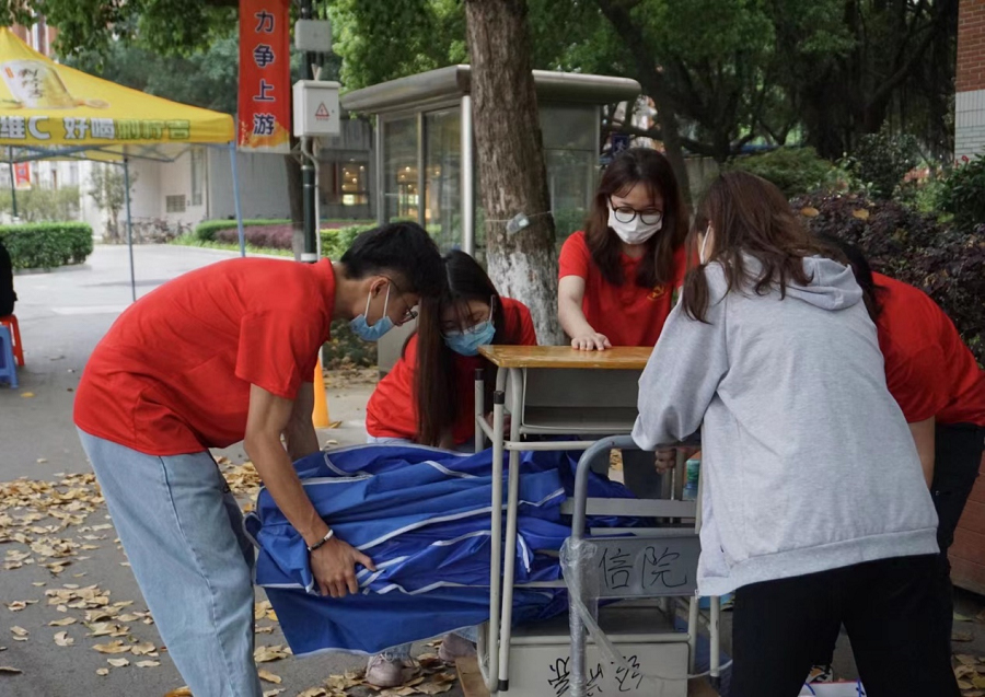 清晨,虽然下起了雨,但没有浇灭党员们服务的心。党员同志们早早将帐篷、桌椅等物资搬运至操场校道旁,搭建起suncitygroup太阳新城体测志愿服务站点,以应对体测过程中出现的各种突发状况。同时安排党员同志向体测员工提供矿泉水、应急食物、医疗急救箱等物资,确保本次体测工作的顺利进行。19级的同学也早已做好了准备,以饱满的精神状态迎接体测长跑。