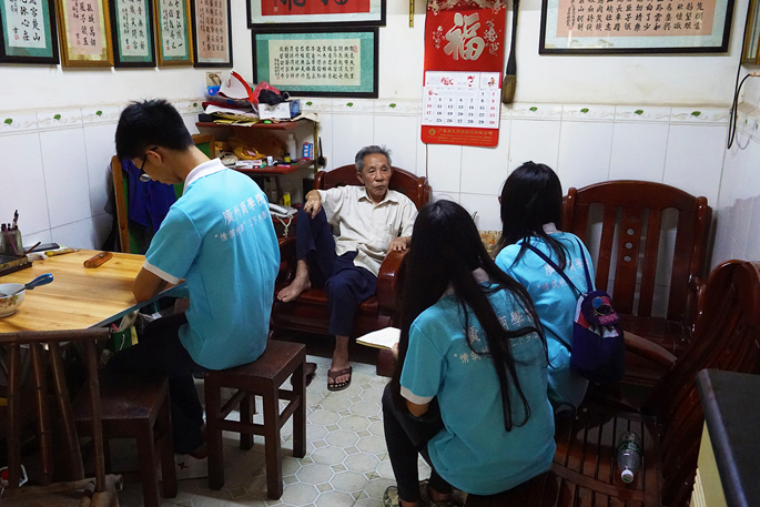 经过一个中午的准备,下午15时志愿者们来到中华街的42号小屋,礼貌诚挚地采访了张宜昌先生并与之合影留念。采访中,张宜昌先生表示,曾与一家北京服饰公司合作,以特制的竹编灯笼作为服饰作品展的背景元素,进一步传播了客家竹编文化。随后,队员们采访了在中华街里巷居住的张焱祥老人。在采访中,老人拿着“梅县民间竹编灯笼技艺大师”的荣誉证书,满脸自豪地说:“做了那么多年,成就感还是有的,制作竹编灯笼还没有人能比得过我”。
