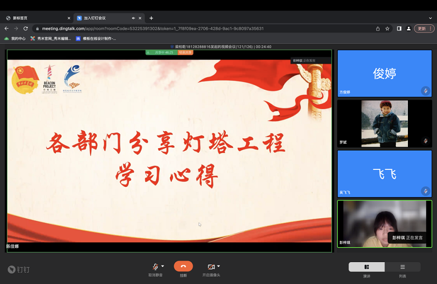 各部门代表依次分享观看灯塔学习视频的心得体会,秘书处代表周柯宇表示,身为新时代青年,应当肩负起时代重任,志存高远,脚踏实地,努力在实现中华民族伟大复兴的生动实践中放飞青春的梦想;组织部代表彭梓琪发言,新时代是属于奋斗者的时代,奋斗诠释着青年人的责任与担当,奋斗更是一种负责的信念与精神,在疫情中,应当贡献自己的一份力量展现青春风采;实践部代表曾琪竣提出,新时代青年遇事要眸色沉静,意志弥坚,不畏艰难,满怀激情,脚踏实地,坚定不移的跟党走;新媒部代表莫止境认为,青年一代用他们的身躯力量为大家抵挡疫情,用实际行动守护着大家,我们要坚定信心,听党指挥,相信我们终将战胜疫情。