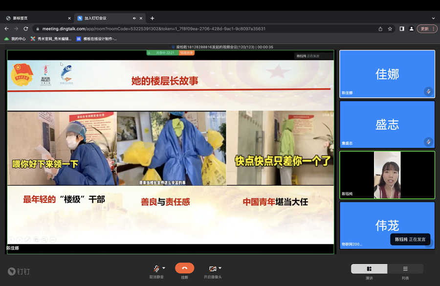 陈钰纯带领团委全体成员学习习近平总书记的“青年观”,她从疫情当下北京大学援鄂医疗队、上海最年轻的“楼级”干部等青年一辈的作为、静默七天里广商志愿者们和全体广商学子共同努力四个方面切入宣讲。根据目前广州疫情严峻的形势,陈钰纯希望团委成员能听党指挥,坚决做到听党话、跟党走,带头做好表率;坚定信心,不信谣、不传谣,以科学严谨的态度应对疫情;坚持担当在前,冲锋在前,积极配合公司开展志愿服务活动,发挥出一名团员的作用,做一名有责任有担当的新时代青年。
