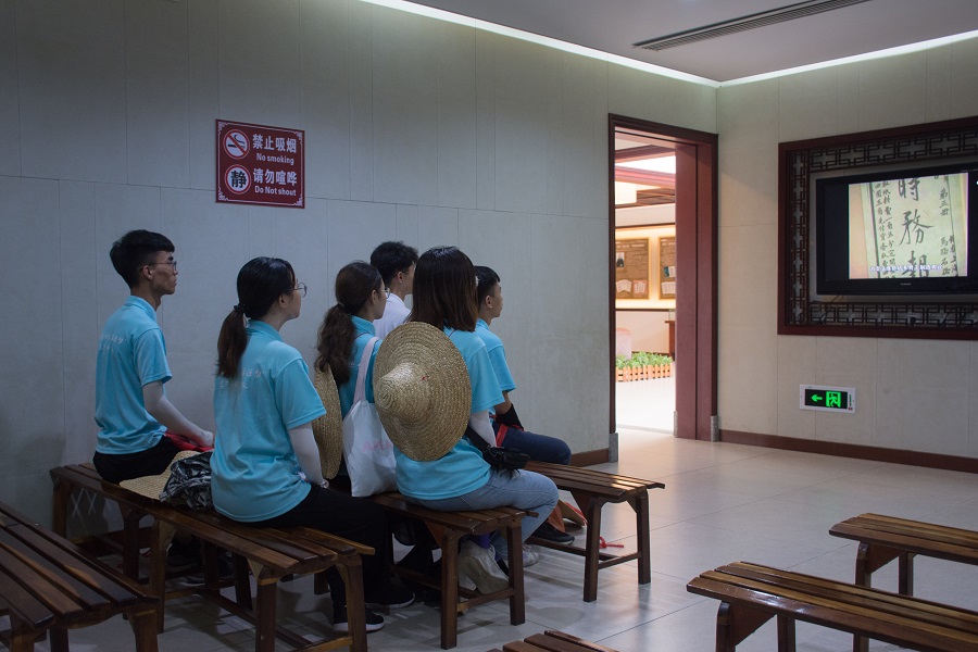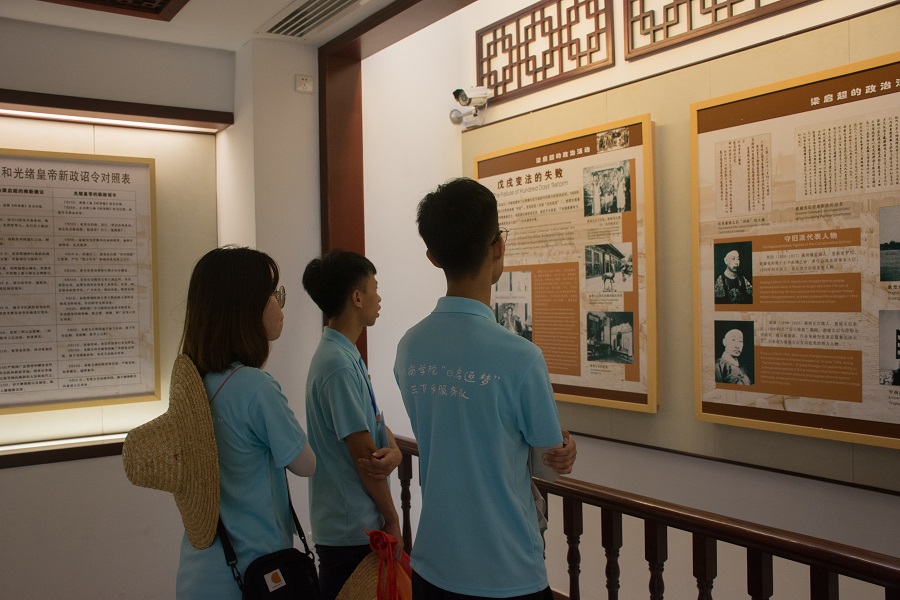 上午十一点整,服务队一行来到梁启超故居。队员们走进梁启超故居的大门,那一张张富有年代感的桌椅仿佛在向大家述说着梁启超先生生前的故事,那破旧不堪的床铺展现了当时生活的艰辛。在故居回廊的壁画里,叙述了著名火箭系统控制专家、中国科公司院士,梁启超先生小儿子——梁思礼的事迹。来到了梁启超纪念馆,首先映入眼帘的是梁启超先生的半身塑像,其后刻着梁启超先生所作的一首著名的歌曲——《爱国歌》。随后,队员们来到了影视播放厅,里面播放着梁启超先生的生平事迹。队员们身临其境,通过影像资料更加生动、深入地了解梁启超先生,更加深切地感受到浓郁的红色文化氛围。从“饮茶龙上水,写字狗爬田”到公车上书、维新变法,纪念馆里图文并茂地介绍了梁启超先生丰富的一生。队员们真切感受到梁启超先生的爱国情怀,为了守护民族大义而奋斗的伟大精神。