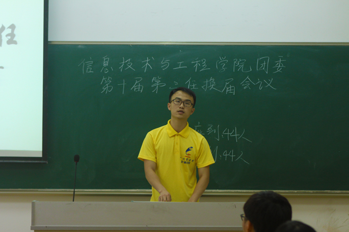 会议开始,主持人钟杏燕同学为会议开场致辞,接着带领全体人员起立奏唱团歌。而后,第十届第一任团委副书记郑泽成同学发言,其对王轻纱老师以及第十届第一任干部们过去一年辛勤付出表示感谢,同时寄语新一任团委的干部们,不忘初衷,改进过去一年遗留的问题,传承信息公司团委的优良品质。