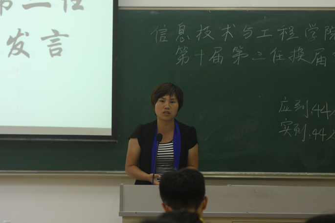 最后,王轻纱老师上台发言,其对老一任干部表示感谢,要求大家在为团委工作的同时能兼顾学习,希望新任部长们在未来一年里不负所望。同时,王轻纱老师提出几点要求和建议:不管是哪一届哪一任干部,都要肩负起维护团委的荣耀的责任;新部长要用最快的时间转换好自己的角色,尽早做好工作计划并按照工作计划完成工作。王轻纱老师以“希望团委越来越好,越来越出色”的寄语结束了此次发言。
