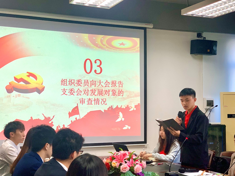 接着,由员工第三党支部组织委员杨旭欢同志向大会报告支委会对重点发展对象的审查情况,宣布陈可盈等18位重点发展对象的审查结果全体通过。在与会党员对重点发展对象是否符合党员条件发表意见进行不记名投票表决环节时,非正式党员在会议室外等候。统计票数后,由组织委员杨旭欢同志宣读支部大会的决议:同意陈可盈等18名重点发展对象转为中共预备党员。