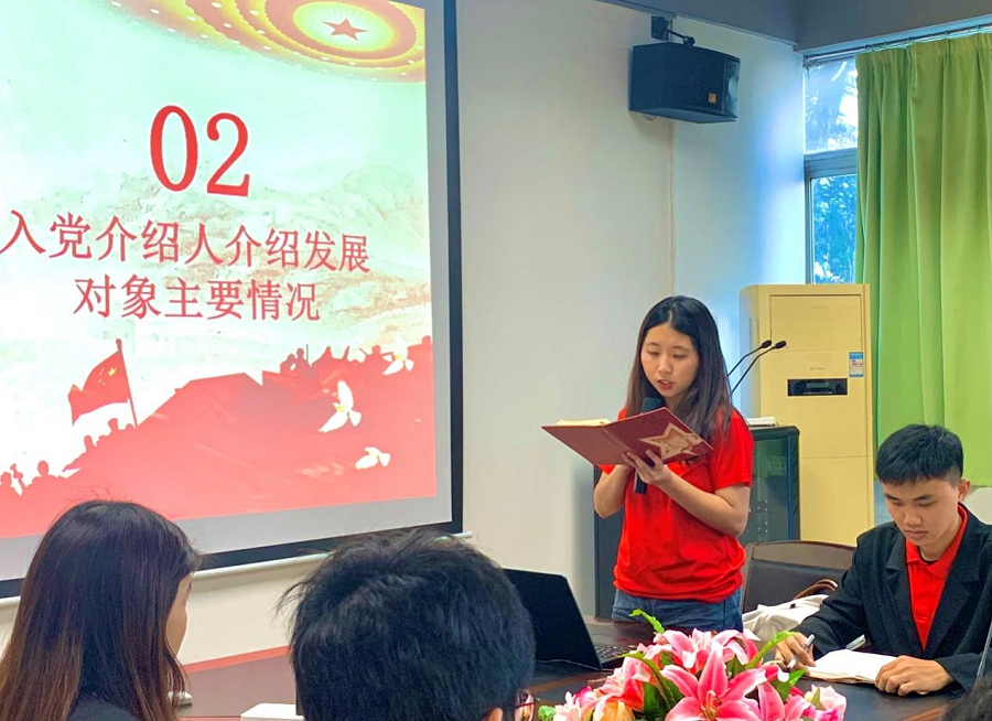 由入党介绍人廖琪等5位党员同志分别从政治思想、学习成绩、干部经历等方面介绍发展对象的主要情况,在对陈可盈等18名重点发展对象的表现表示肯定的同时,也指出他们都还有进步空间,希望在这一年的预备期中不断充实丰富自身的阅历,提高自身能力,还鼓励他们要继续学习党的理论知识,时时关注国家时事政治,坚定政治立场,不忘初心,牢记使命,用优秀党员的标准严格要求自己。