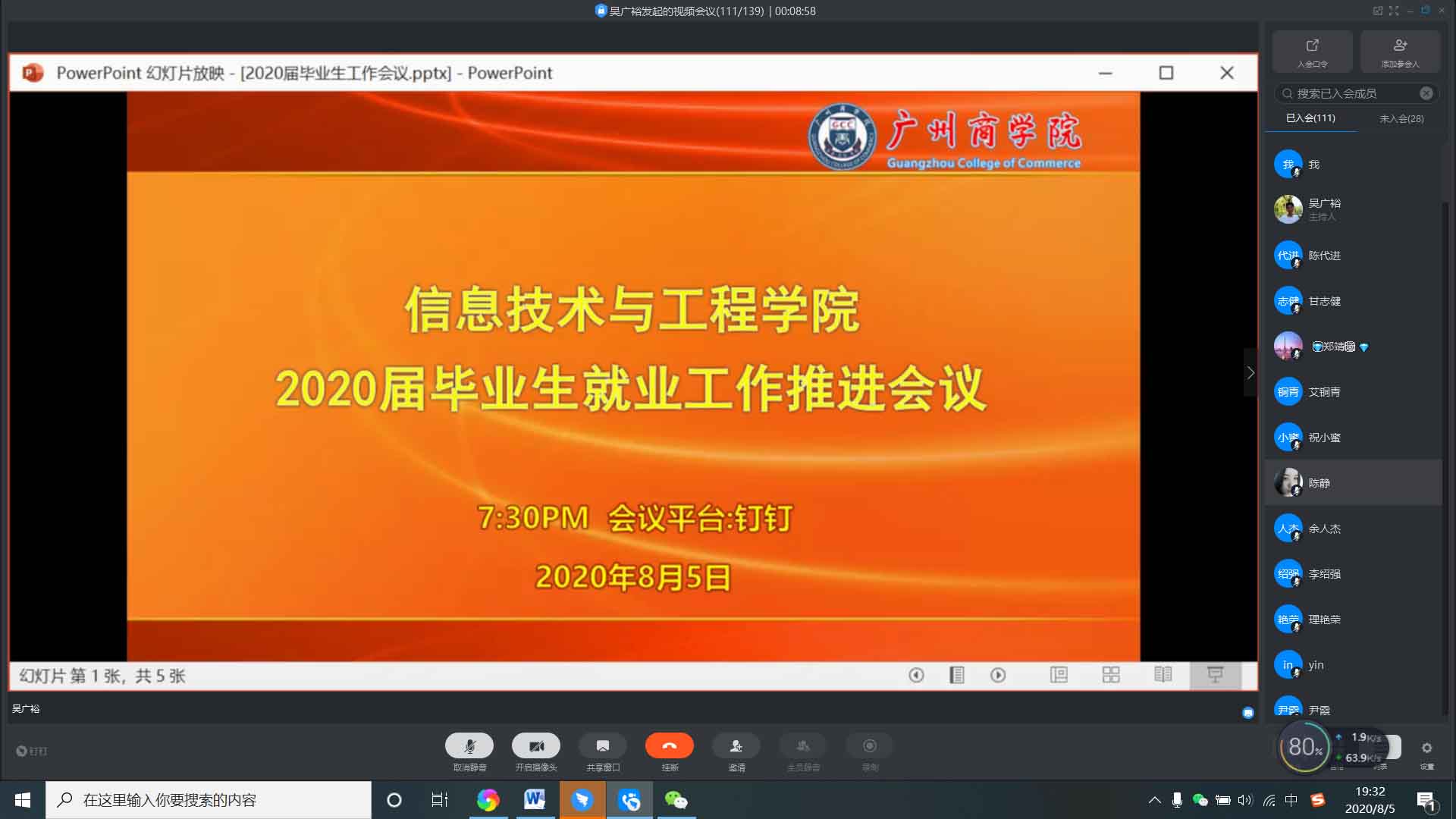 为深入推进公司2020届毕业生就业工作, 抓住当前毕业生就业工作的关键冲刺阶段,促进毕业生充分和高质量就业,确保如期完成2020届毕业生就业工作目标任务,suncitygroup太阳新城于8月5日晚上通过“钉钉”平台线上开展毕业生就业工作线上推进会,出席本次会议的嘉宾有suncitygroup太阳新城经理姜灵敏、副经理吴广裕、党总支书记关俊明以及公司全体教师。会议由副经理吴广裕主持。