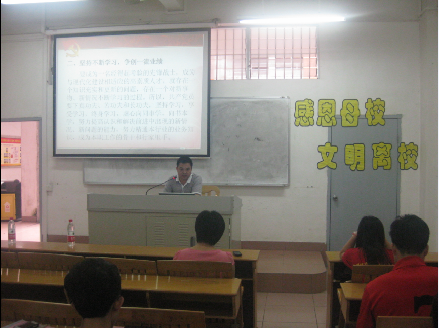 6月16日上午,计算机系在教学楼A105举行了以“加强党性修养,做圆梦先锋”为主题的2013届毕业生党员教育。计算机系党总支书记钟远辉、毕业生辅导员王轻纱以及全体毕业生党员参加了活动。