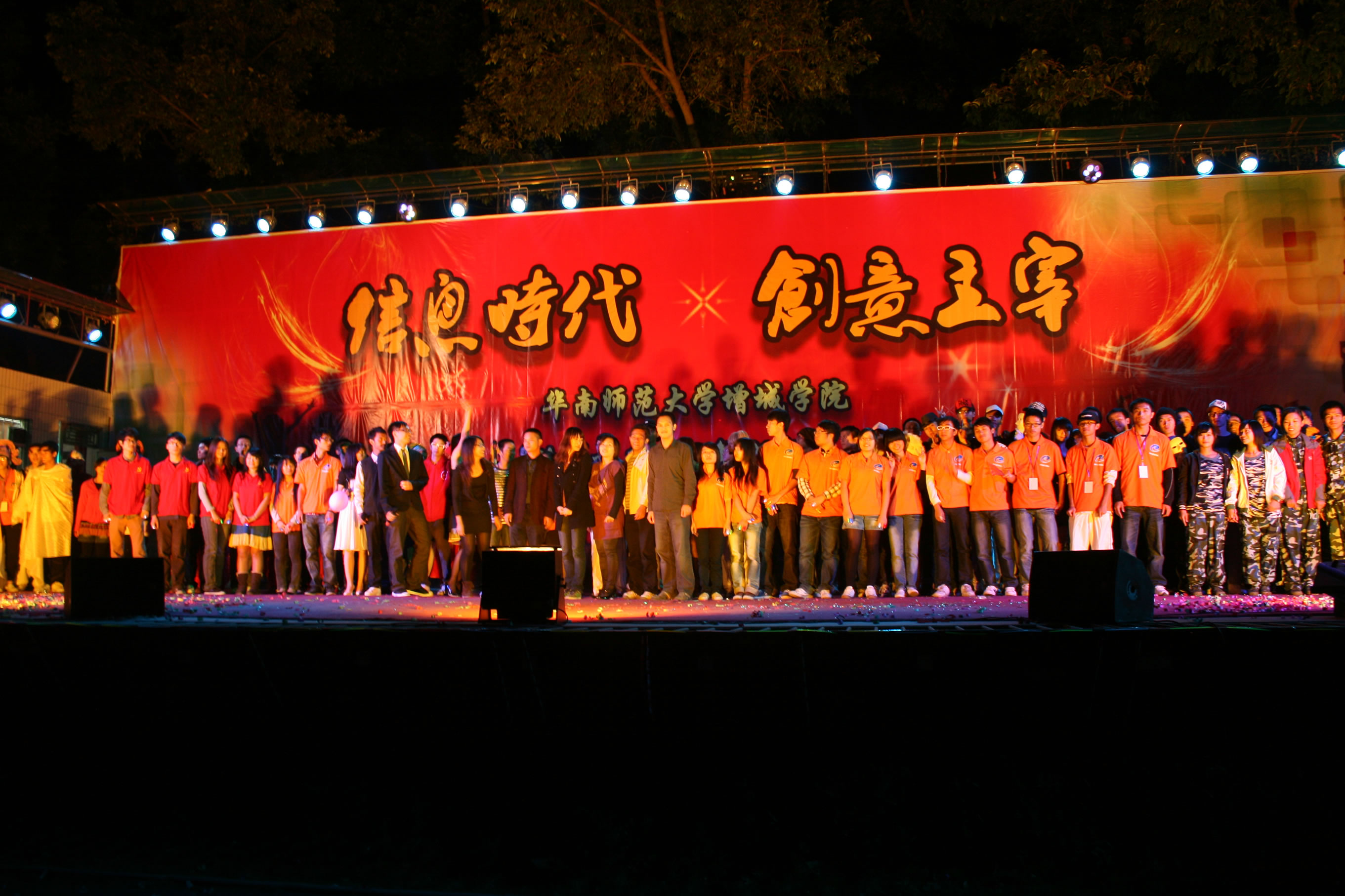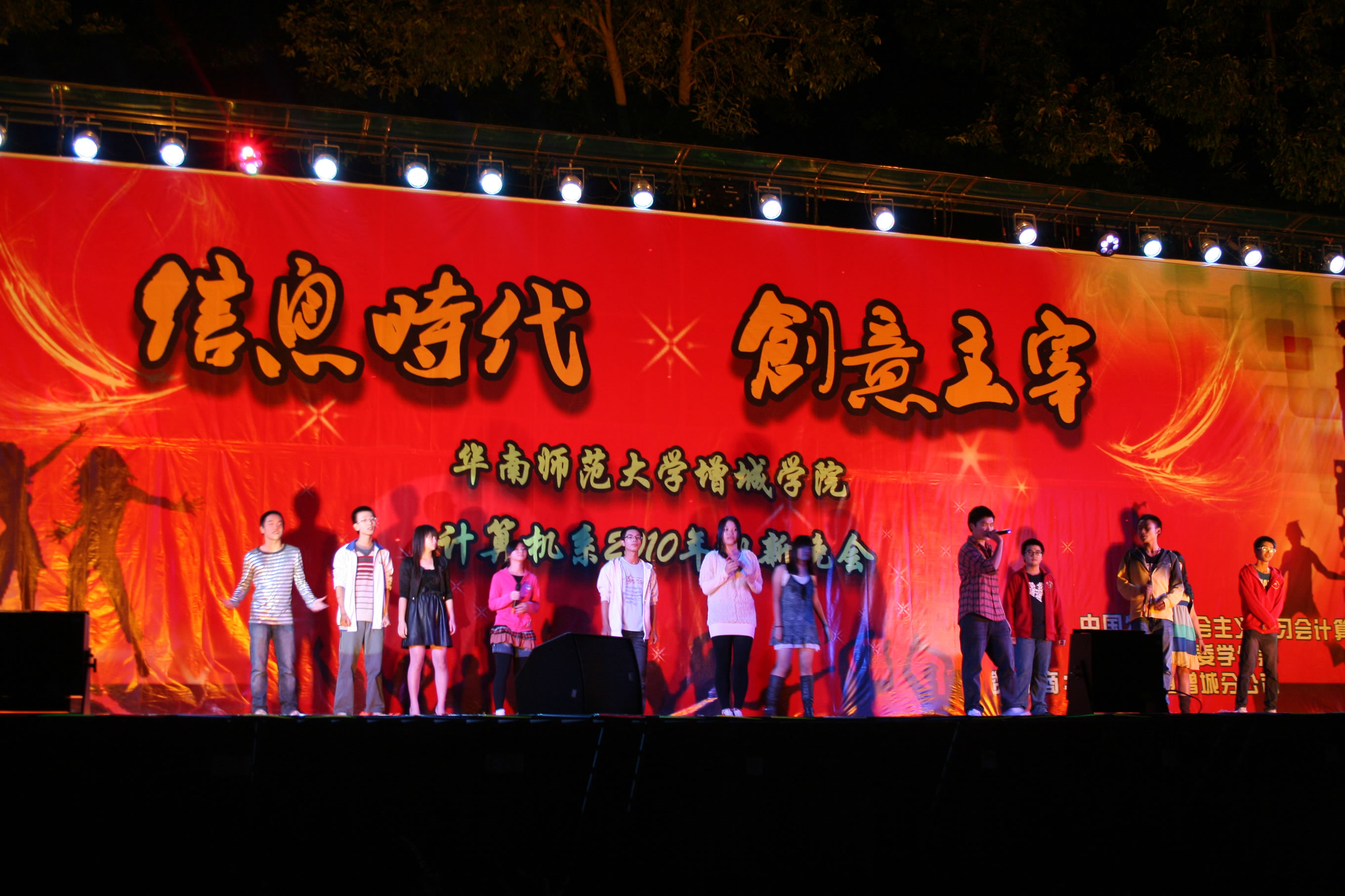 金秋送爽,十月飘香。10月29日晚上7∶30,华南师范大学增城公司计算机系在足球场隆重举行了以“信息时代,创意主宰”为主题的迎新晚会。出席本次晚会的有各系领导、老师以及我系10级全体新生。
