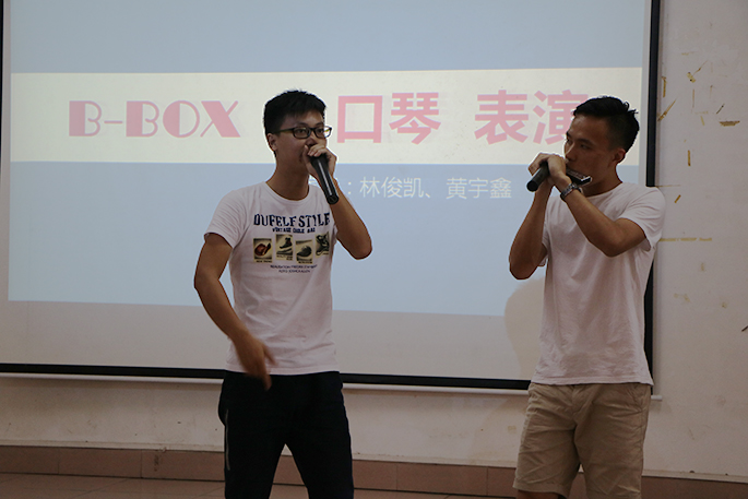 愚昧盲目的生活是无感,没有目标的人生是空洞的,令人印象深刻的致辞仍回荡脑海,回味中便传来动感十足和旋律轻快的节奏,这是由14级应电班的黄宇鑫和14级网工一班的林俊凯所带来的B-box和口风琴合奏,调动了全场的气氛,使得在场员工也跟着律动。