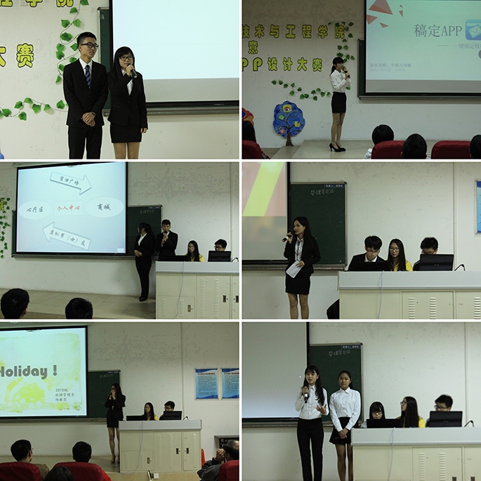 决赛伊始,现场观众首先观看关于信息技术发展历程的回顾视频,引出了APP软件在当今与未来的应用和需求,而嘉宾观众们更是对选手设计的作品充满了期待,本场比赛序幕随之缓缓升起。其后,在选手的作品展示时间内,每组选手上台对其作品进行具体讲解,每组作品可谓创意无限,在关注时下新闻热点的基础上,体现了作品的高度可行性等特点。如:一款关于校园的APP,其在融合NFC功能之时,增添校内还书提醒、饭卡充值等实用化功能以及娱乐分享、摇一摇等的趣味化功能,让员工能在出行时实现最大便利化;另一款关于投稿的APP,创作者在调查当下市场相关情况,发现暂无此类APP,在这构思下对适用人群、使用价值、应用场景等板块进行完善,设计出又一令现场观众叹为观止的APP。