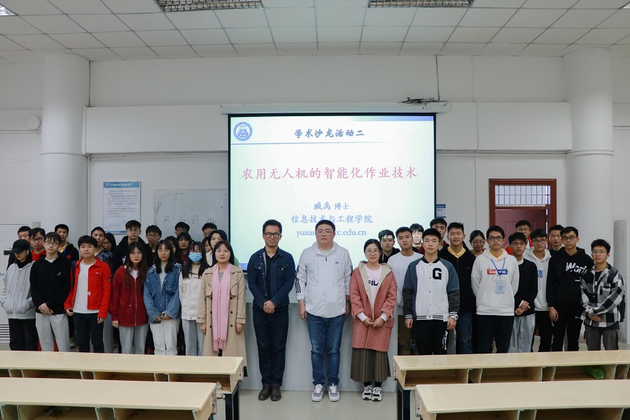 臧禹博士从多旋翼无人机的基本组成作为切入,向师生们介绍了多旋翼无人机的基本概念以及构成。他通过阐述“农用无人机简介、国内农用无人机的发展状况、农用无人机智能化作业技术”三个方面的内容,以自身对无人机的认知和多年的经验,并用视频结合具体案例分析,从而更加详细讲解了农用无人机在农业中的重要作用。在场的师生们全神贯注、认真听讲,对农用无人机的解说表现出浓厚的兴趣。随后,他通过生动的影像为师生们展示了农用无人机的航拍过程,躲避障碍物的灵活性以及其功能的多样性,并分析了农用无人机的使用情况、未来发展机遇。他鼓励师生对该领域的技术进行深入的了解、学习与研究。臧禹博士将我国农用无人机与发达国家做出对比,并提出我国发展植保无人机有巨大的市场和发展空间,植保无人机是“农业智能化”的一种体现,是未来的发展趋势。