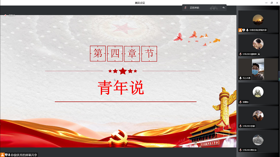 为全面贯彻十九届六中全会精神,迎接党的二十大,积极引导同学们学习党的历史,牢固树立“四个意识”,坚定“四个自信”,做到“两个牢固”,不忘初心、牢记使命,深刻认识到中国共产党的初心和使命就是为了人民谋幸福,为中华民族伟大复兴,让其更加明确自己的目标,引领青年员工永远跟党走,明确党的思想,以积极向上的精神风貌,在新征程中展现自己。20级计科3团支部于4月14日以线上形式开展“喜迎二十大、永远跟党走、奋进新征程”主题团日活动。会议由团支书温玉柱主持。