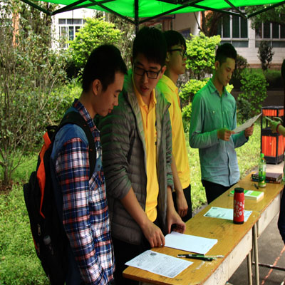 虽是本次摆摊活动的第一天,但工作人员还是提前进入了状态。不到下课的时间,工作人员已经摆好摊,等待前来报名的同学们。不期而遇的风雨天气削弱不了工作人员的热忱,更阻碍不了同学们前往报名与咨询的步伐。校道上,对其活动感兴趣的同学们更是络绎不绝,工作人员则更卖力宣传,用微笑迎接、耐心积极地进行讲解,力求解答其疑惑。