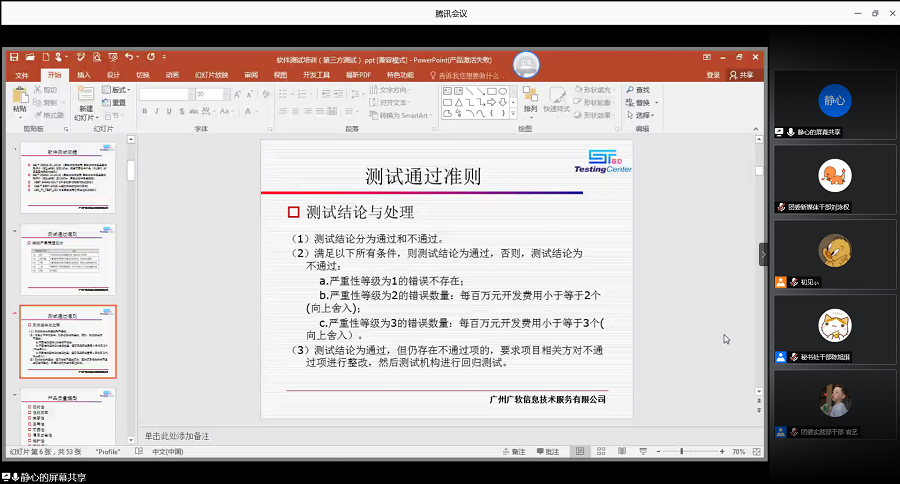 会议伊始,刘新就软件测试目标、软件测试依据、测试通过标准、产品质量模型以及测试准备阶段五大方面,对在场员工进行软件培训。刘新先为员工介绍软件测试的三大目标,分别是提高软件品质、认清软件定位和支持国家软件测试,然后详细地介绍了测试的结论与处理方法,并从功能性、性能效率、兼容性、易用性、可靠性、信息安全性、维护性、可移植性等多个方面向员工讲解了软件的产品质量模型种类。最后,刘新简单介绍了测试准备阶段的工作任务,并向员工展示了软件测试模型。