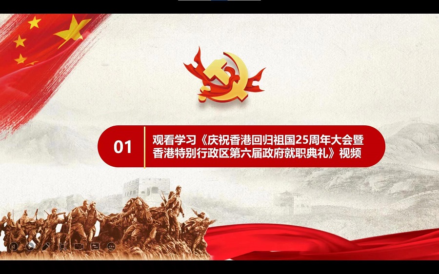 会议伊始,全体党员同志共同观看了《庆祝香港回归25周年大会暨香港特别行政区第六届政府就职典礼》视频,聆听了习近平总书记的重要讲话,深刻理解“一国两制”实践规律是确保“一国两制”事业行稳致远的重要前提,在全面建设社会主义现代化国家、实现中华民族伟大复兴的历史进程中,香港的未来一定会更加美好!