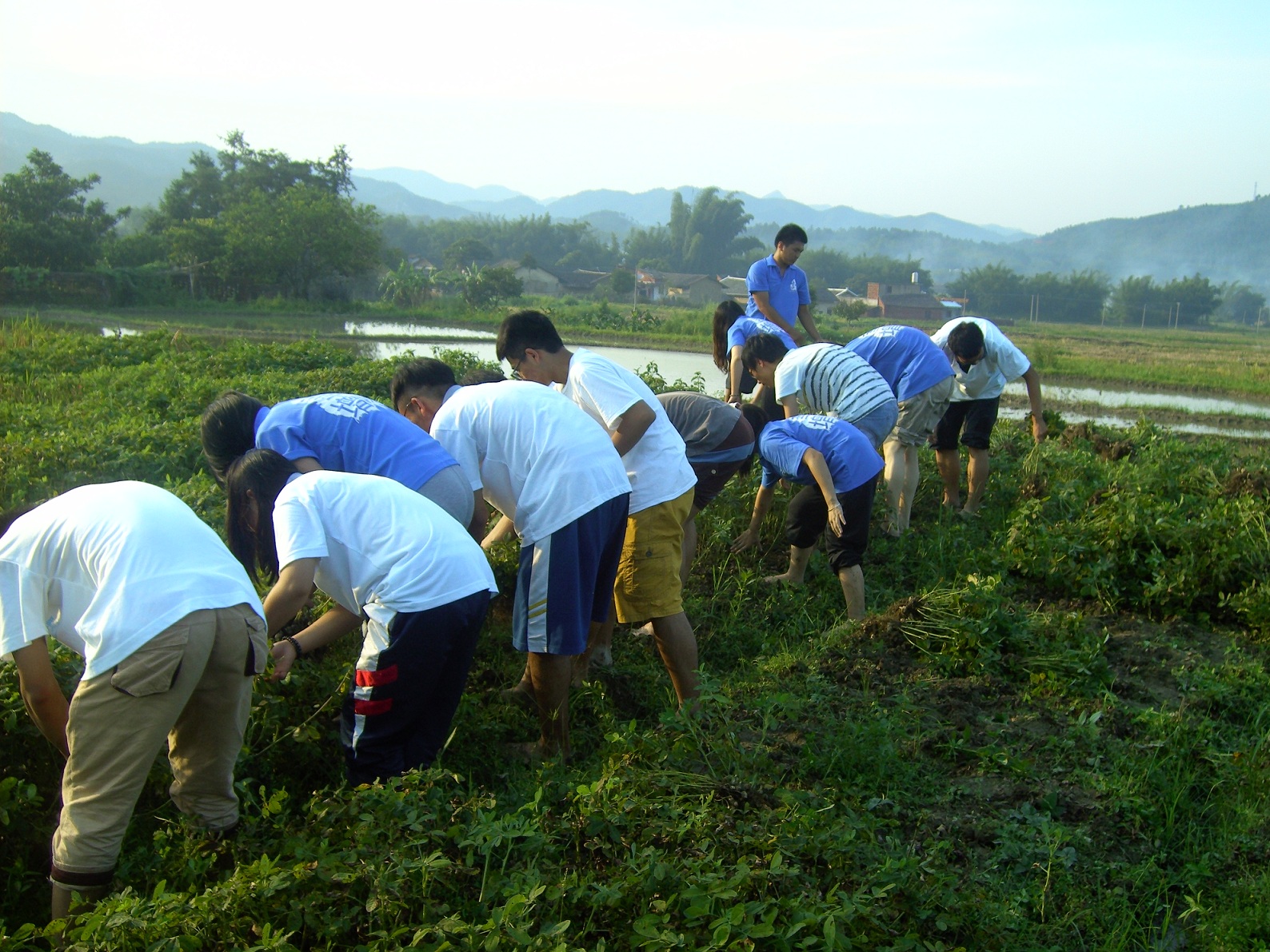 下午4时许,支教活动结束后,志愿者们来到了田间与当地村民一起务农,体验生活。我们这次的务农活动是帮助当地居民将花生地的花生都拔出来,然后还要在小溪里的水中洗掉泥土。拔花生是一项看似简单但事实上却十分艰巨的工作,我们不仅要把花生拔出来,还要把花生放到水里把泥土洗一洗,这两个步骤看起来貌似很简单也很容易操作,但当重复这个动作许多次后,便会感觉到腰酸背疼,深深地体会到农民工作的不容易。不仅如此,干农活还需要我们注意安全,并且在田间工作所需要注意的问题也有很多,这些都是我们平时不能单纯地从书本上学习到的。于是我们也可以验证一句话——实践出真知。