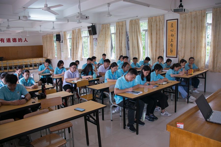 统筹组美味可口的午餐洗去了队员们的劳累,经过了短暂的休息之后,队员们在多媒体教室召开工作会议暨开幕仪式。会议伊始,服务队队长梁瑞聪为队员们讲解了未来几天的工作规划以及各项工作的详细要求。在队长发言完毕之后,服务队指导老师郑开勋上台讲话。他从安全、生活、纪律这三个方面强调了队员们应该要注意的事项,并强调到队员之间应该多交流,多互动,营造一个舒心愉悦的工作和生活环境。此次工作会议,让队员们对此次的暑期三下乡社会实践活动有了更清楚的认识,对未来十天的工作也有更加详细的规划。