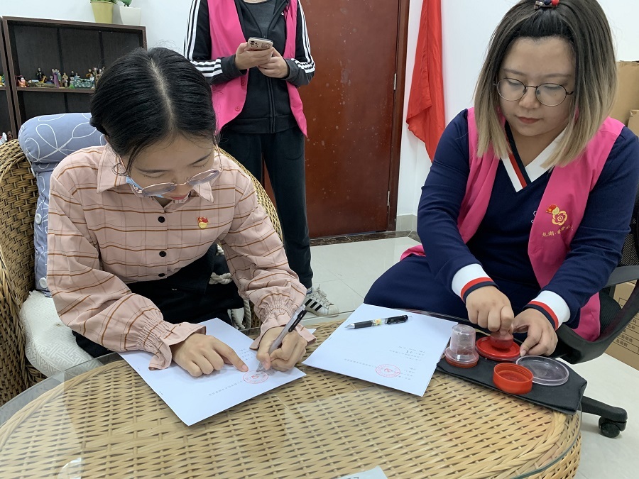 e行动-志愿服务队于下午5时抵达九佛街社工服务站,并与李菁、陈慧敏进行了简单的会谈。双方就如何创新志愿服务活动形式这一问题进行了深入的讨论,致力于以信院特色打造新颖的特色志愿服务活动,在交流探讨的同时,李菁、陈慧敏介绍了九佛社工服务站近期志愿服务工作状况。通过此次简单的会谈,e行动-志愿服务队对今后的志愿服务计划有了进一步的规划,为今后各项志愿服务工作的开展奠定基础。随后,李菁与陈钰纯相互交换和审阅各项资料及协议,双方在认真审阅协议以及确认资料无误后进行签字,完成此次九佛街社工服务站点的挂牌仪式。